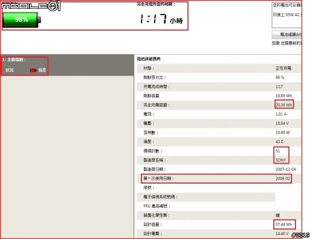 唉, 我也算是受害者了吧, 購入X61是2008/2月下, 用到現在一年二個月.在滿一年時, 有曾使用電池維護, 當初只少了一點點, 所以心想還好, 那知, 昨天在用筆電時,明明還顯示有二小時, 卻直接進休眠, 不死心, 我做電池修護之後, 狀況就變如下了 .搞到現在就算只開一小時的會, 也要帶著AC隨身走, 冏.還有一個重點, 連完全充電時間都有問題了...