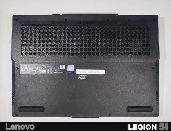 ▲ Lenovo LEGION 5i背面中央還貼有安規標籤、警語與Windows信仰貼紙。