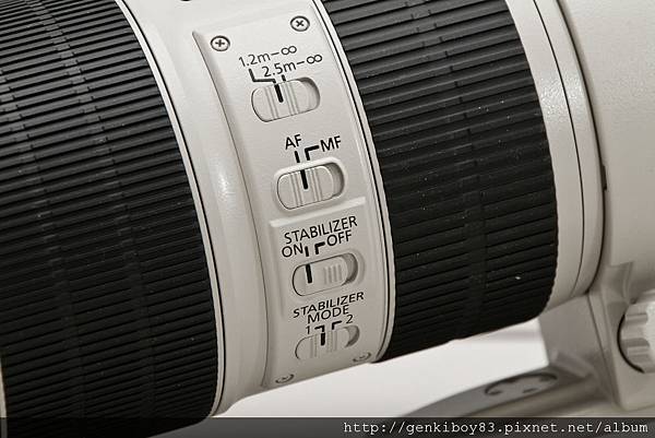 鏡身中段有幾四個開關,第一個是對焦距離,可以鎖定對焦的距離區間,第二個是手動跟自動對焦的切換,第三個是防震的開關,第四個則是兩種不同防震的模式,2是只有垂直防震,1是上下左右都有做修正