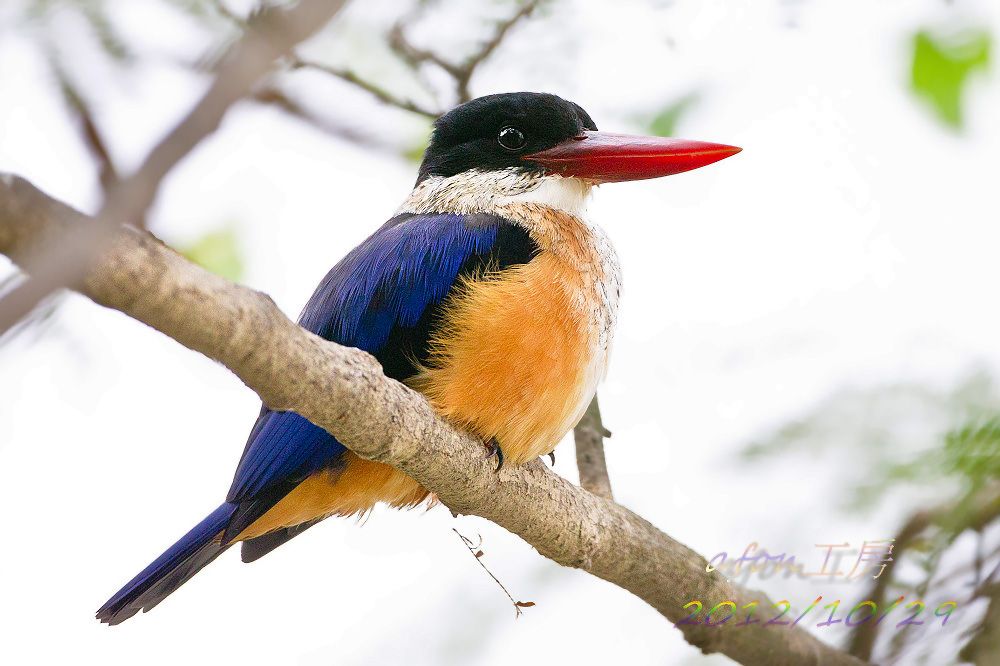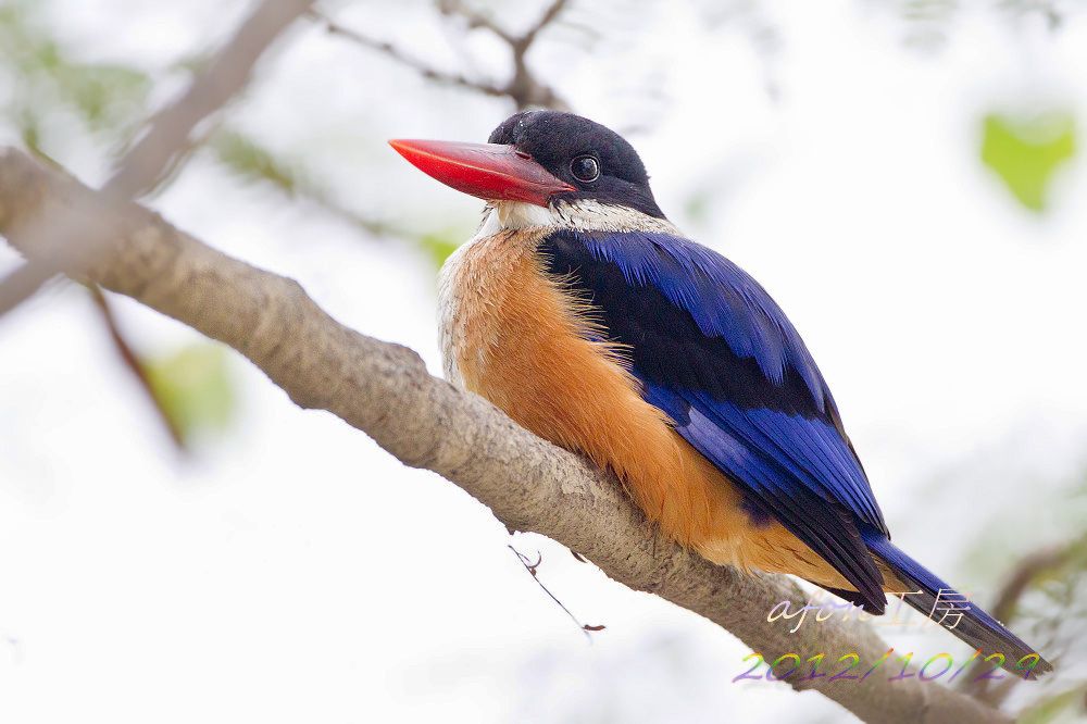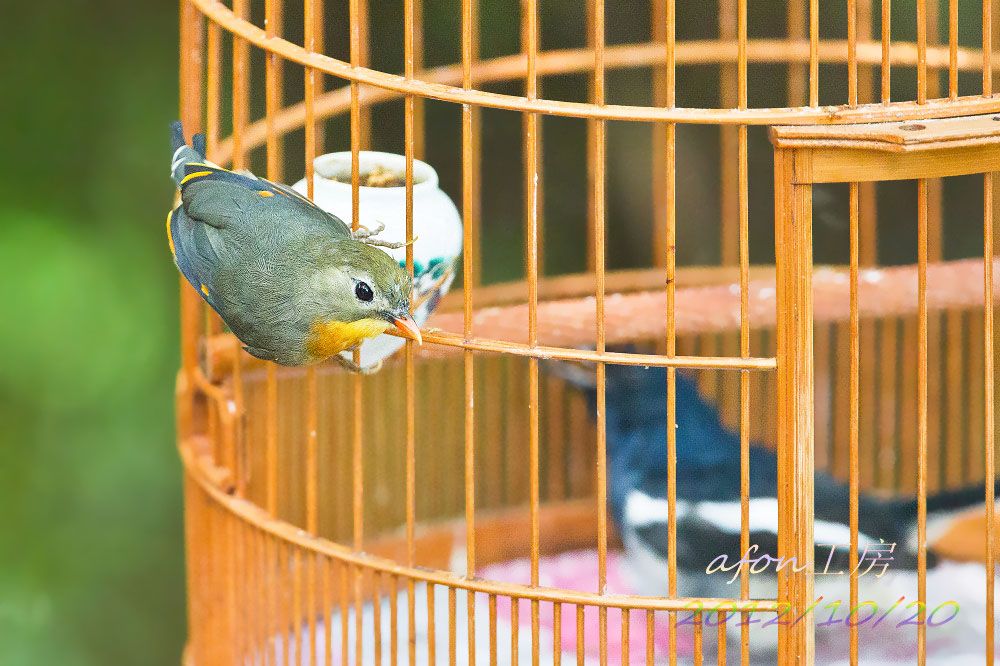 鳥籠頂有隻羽色亮麗的鳥兒,原來是隻紅嘴。