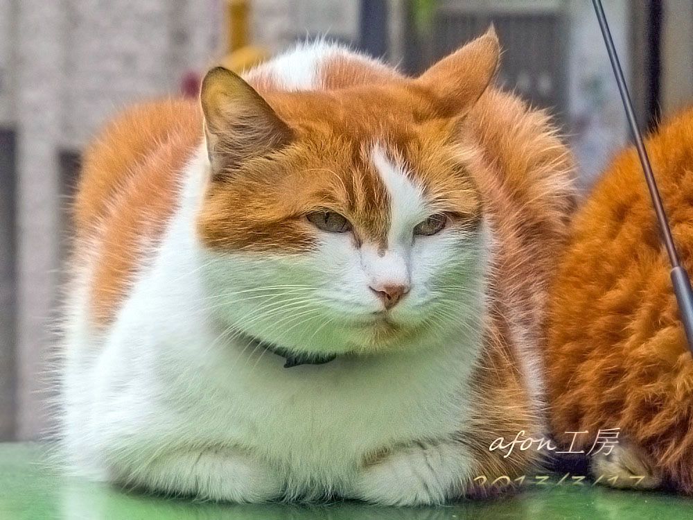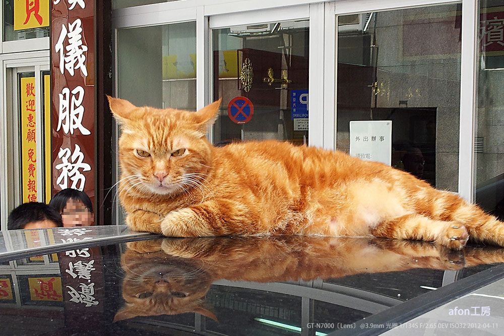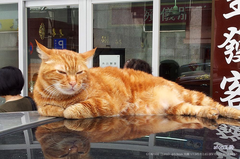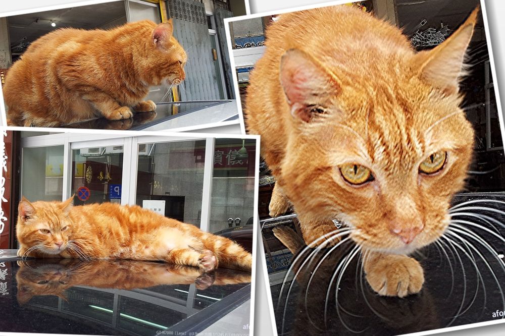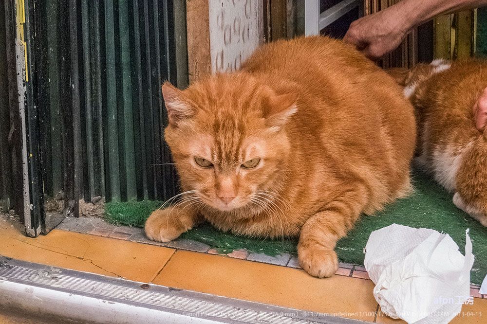 店舖,打算逗逗兩隻貓咪---大黃及大尾。只見大尾無精打彩地躺著,與店主