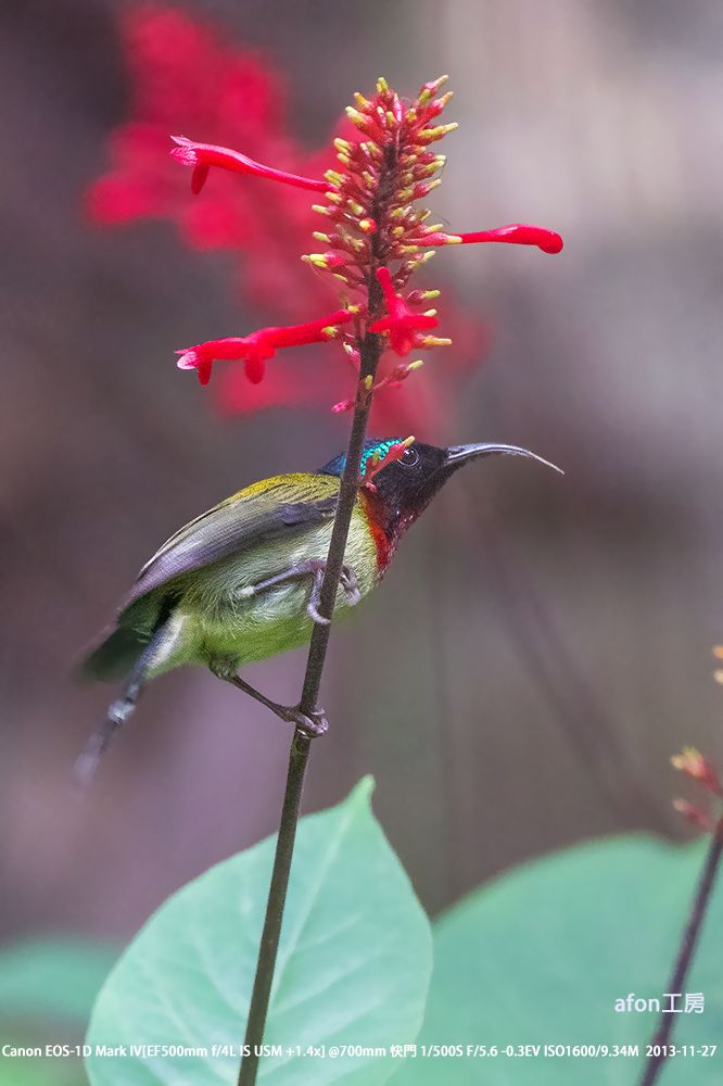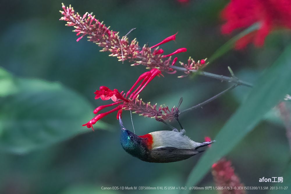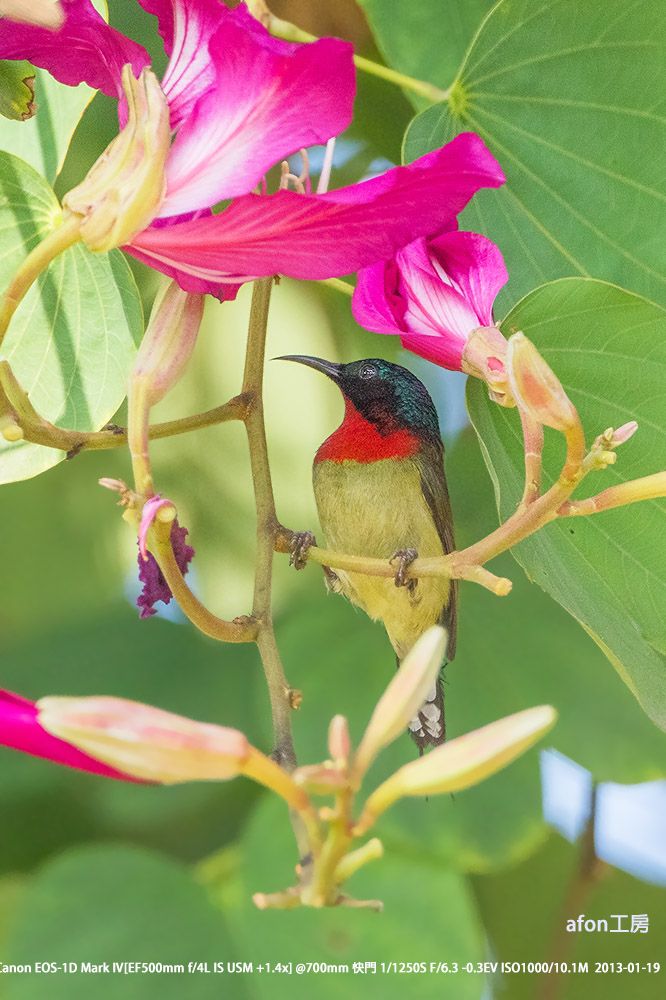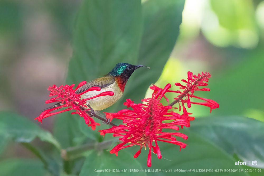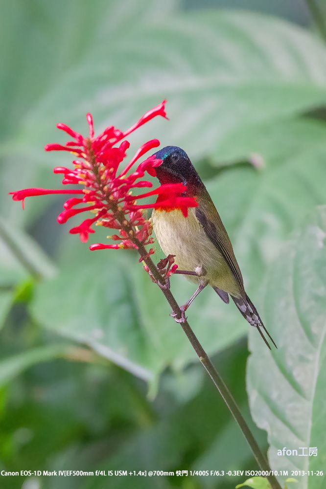 暗淡的太陽蜂鳥是美洲的特有品種,我們亞洲是沒有這種可愛的雀鳥的。開始鳥攝時,首次拍攝叉尾太陽鳥雄鳥時,見這隻羽色奪目的小傢伙以卓越的飛行能力,懸停在吸食花蜜,直觀地將之誤為蜂鳥。後來經前輩指點,方知是個美麗的誤會。叉尾在澳門屬留鳥,但在幾年的外拍中,僅在冬候鳥來訪及至翌年春天,才能間斷地拍得牠們。此外,也從未在澳門見過叉尾雛幼鳥(在香港嘉道理農場曾拍過換羽中的幼鳥)。01.去年11月底,在離島某郊野公園傳來紅尾水鴝的鳥訊,我也在那邊等候了幾天。期間,經常有叉尾來湊熱鬧。02.這隻雄鳥是受了這些小紅花的召喚而來的,可惜這裡的樹蔭蔽天,感光度直達iso5000。03.高感光度令照片顆粒超粗,經後製也仍留下很多痕跡。04.為了不影響主角---紅尾水鴝,只得靜靜地坐著從約10米外拍攝。05.想以較接近拍攝距離減少不用裁切太大而產生的顆粒,但基於上述原因也只好作罷。06.從未拍過叉尾的懸停吸蜜動作,這次因為距望較遠,反而拍得這種紀錄。為遷就感光度,快門速度只能設在安全快門(沒想到拍懸停),所以無法將拍翼動作凝結下來。07.叉尾雄鳥下嘴末端至胸部的羽毛是鮮紅色的,並呈三角形,三角的兩腰則是閃亮的淺藍色。08.除了飛行技術了得之外,叉尾還有一招絕技,就是倒吊吸蜜。09.向下彎的長嘴是叉尾的專用餐具,留意嘴尖還伸出牠那細長的舌頭。10.後來曾再去那郊野公園,希望能專心拍一次叉尾,可惜整個上午都未有出現。11.再來一張去年初時拍的,一般叉尾都留在離地3、4米的橫枝,所以只能以仰拍方式拍攝。叉尾太陽鳥Fork-tailed Sunbird,學名Aethopyga christinae,分類為:雀形目>太陽鳥科>太陽鳥屬外拍時帶備一條毛巾,既比用紙巾實際,又能減少使用紙張,不妨試試。afon