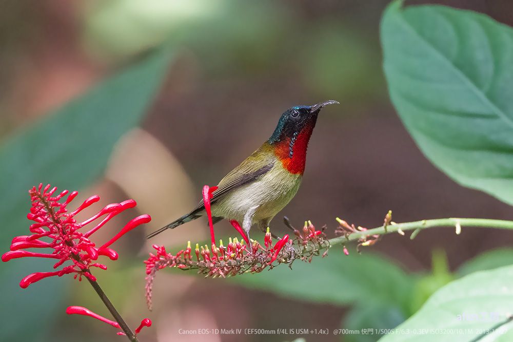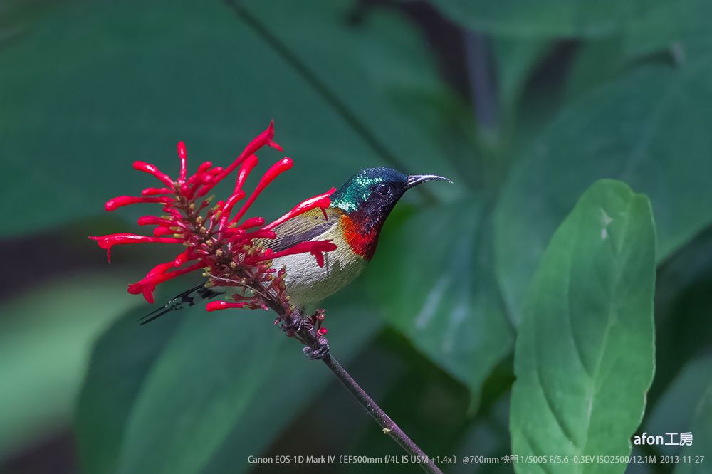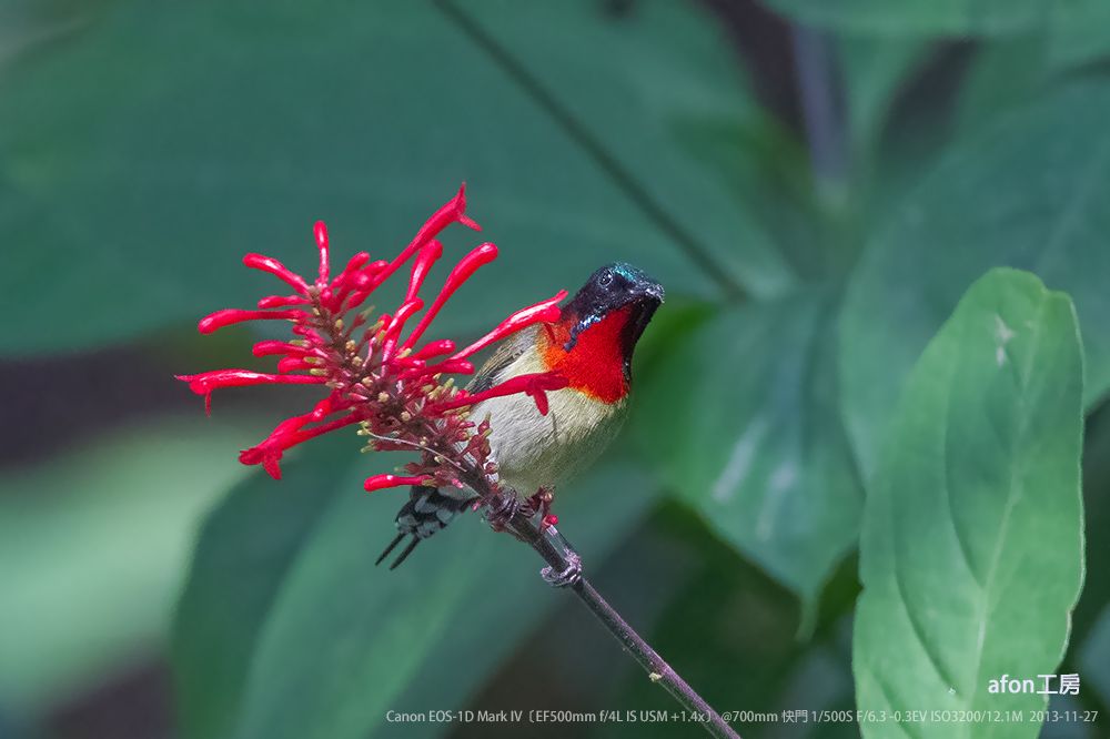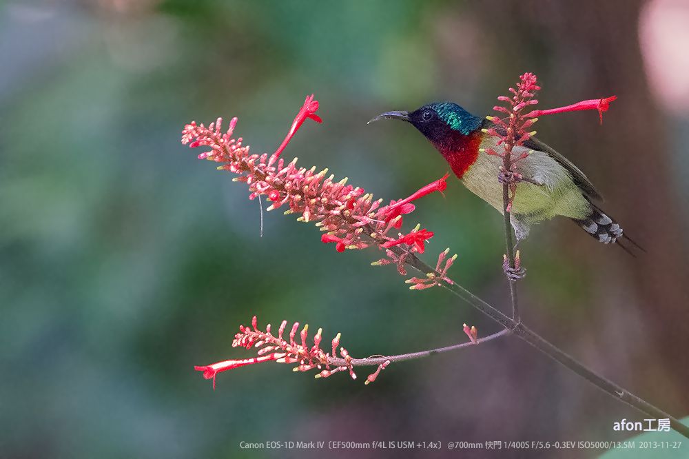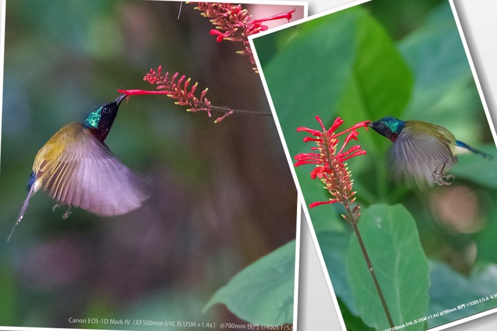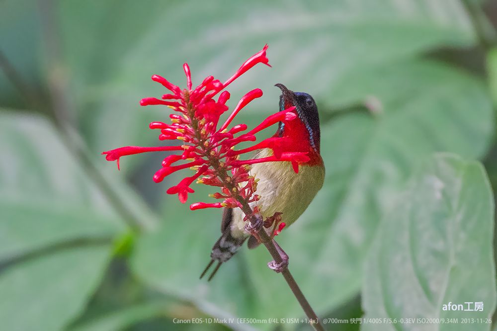 暗淡的太陽蜂鳥是美洲的特有品種,我們亞洲是沒有這種可愛的雀鳥的。開始鳥攝時,首次拍攝叉尾太陽鳥雄鳥時,見這隻羽色奪目的小傢伙以卓越的飛行能力,懸停在吸食花蜜,直觀地將之誤為蜂鳥。後來經前輩指點,方知是個美麗的誤會。叉尾在澳門屬留鳥,但在幾年的外拍中,僅在冬候鳥來訪及至翌年春天,才能間斷地拍得牠們。此外,也從未在澳門見過叉尾雛幼鳥(在香港嘉道理農場曾拍過換羽中的幼鳥)。01.去年11月底,在離島某郊野公園傳來紅尾水鴝的鳥訊,我也在那邊等候了幾天。期間,經常有叉尾來湊熱鬧。02.這隻雄鳥是受了這些小紅花的召喚而來的,可惜這裡的樹蔭蔽天,感光度直達iso5000。03.高感光度令照片顆粒超粗,經後製也仍留下很多痕跡。04.為了不影響主角---紅尾水鴝,只得靜靜地坐著從約10米外拍攝。05.想以較接近拍攝距離減少不用裁切太大而產生的顆粒,但基於上述原因也只好作罷。06.從未拍過叉尾的懸停吸蜜動作,這次因為距望較遠,反而拍得這種紀錄。為遷就感光度,快門速度只能設在安全快門(沒想到拍懸停),所以無法將拍翼動作凝結下來。07.叉尾雄鳥下嘴末端至胸部的羽毛是鮮紅色的,並呈三角形,三角的兩腰則是閃亮的淺藍色。08.除了飛行技術了得之外,叉尾還有一招絕技,就是倒吊吸蜜。09.向下彎的長嘴是叉尾的專用餐具,留意嘴尖還伸出牠那細長的舌頭。10.後來曾再去那郊野公園,希望能專心拍一次叉尾,可惜整個上午都未有出現。11.再來一張去年初時拍的,一般叉尾都留在離地3、4米的橫枝,所以只能以仰拍方式拍攝。叉尾太陽鳥Fork-tailed Sunbird,學名Aethopyga christinae,分類為:雀形目>太陽鳥科>太陽鳥屬外拍時帶備一條毛巾,既比用紙巾實際,又能減少使用紙張,不妨試試。afon