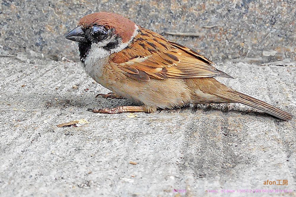 可憐的小麻雀中午往食店買午餐,發現門前近牆雜物有團東西,初時還在心裡罵店家不衛生,竟然在門前也有老鼠,細看之前始知原來是隻麻雀。01.說也奇怪,這隻小傢伙就蹲在地上,而且任無動靜。02.用手機拍攝時,牠終於轉身,這時發現牠的左眼突了出來。不知是否為爭奪異性而大打出嘴,最後導致嚴重受傷。看來牠應...03.再貼兩張之前拍攝的,麻雀是本地的普鳥,有時可以非常接近的。04.這兩張拍攝距離是3.14米,差不多是大眼睛328的最近拍攝距離。麻雀Eurasian Tree Sparrow,學名Passer montanus,分類為:雀形目>麻雀科>麻雀屬afon