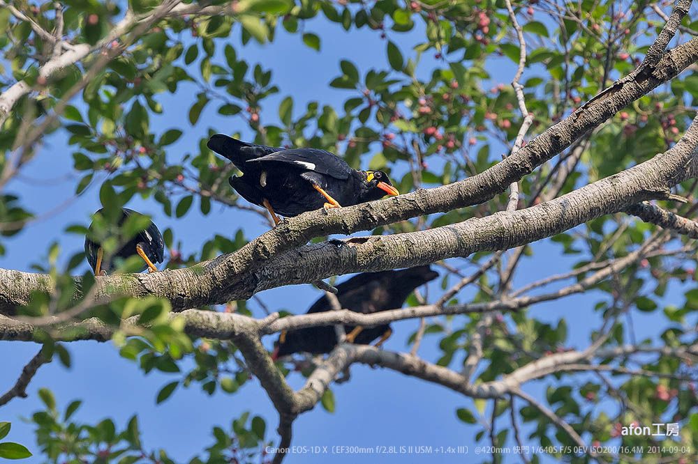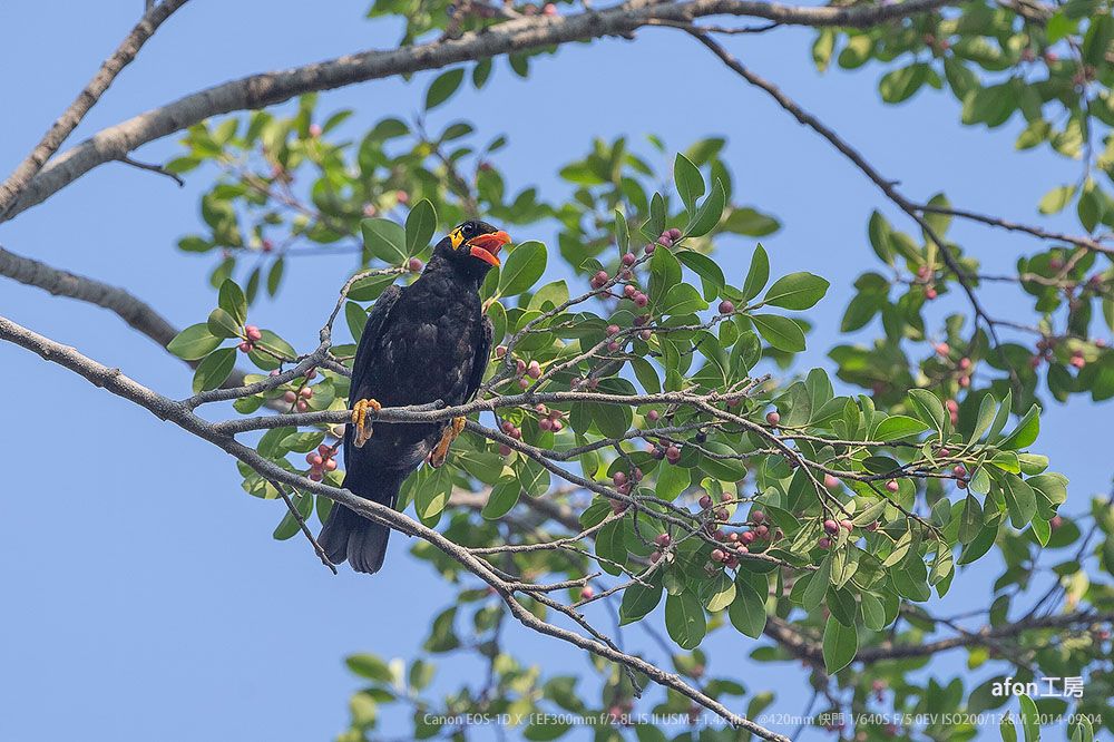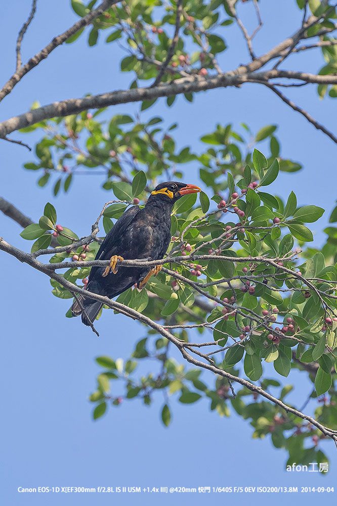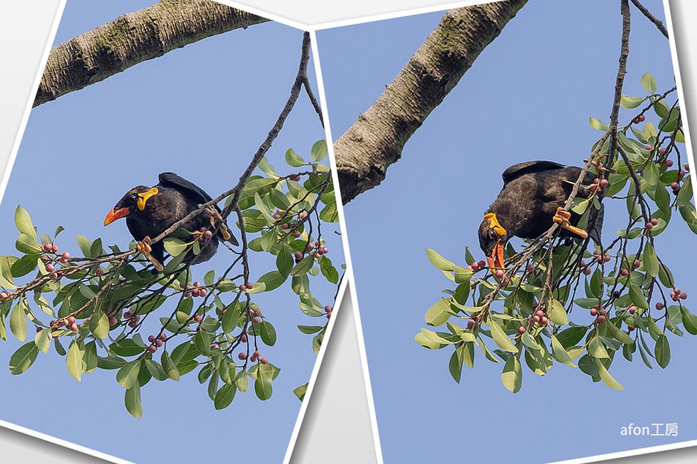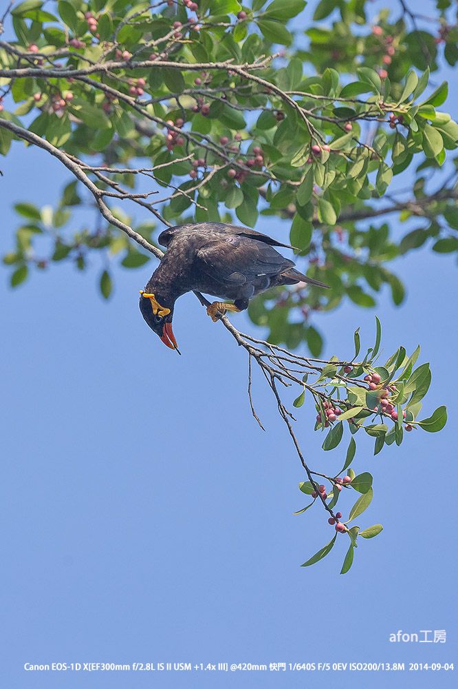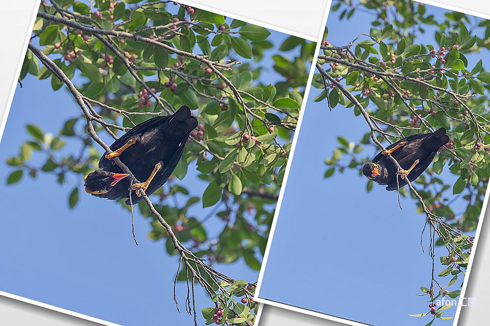 體操高手鷯哥個頭頗大(身長29厘米),但卻常在樹枝間做出很多高難度動作,就如體操皇子一樣。01.仗著有對強而有力的爪,鷯哥縱橫樹枝,採果不費吹灰之力。02.就算要取小樹枝築巢或是甚麼的,牠都能來去自如。03.經常使出「倒掛金鈎」這絕招。04.鷯哥喜聯群結社,而且呼朋引類,熱鬧非常。05.炮台山有個小群落,是這裡的常客。06.鷯哥Common Hill Myna,學名Gracula religiosa。據《澳門鳥類》所載,鷯哥屬逃逸鳥,但多年都在炮台山見到,估計已落戶在澳門了。一般雀鳥都怕人,但若披上偽裝,您甚至可與牠接近到3、4米。因此,使用偽裝,既可拍得較佳的照片,又可盡量避免驚擾雀鳥,不妨試試。afon