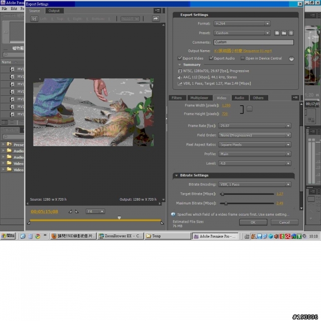 主要是要上傳至YOUTUBE...不知道大家都用哪一套軟體轉檔?A: Premiere cs4因為它可以作離線編輯,讓你先匯入小影片,後改成大影片,這樣編起來就很順至於小影片的尺寸我覺得300多互乘就好,比例一定要一樣,尺寸不要太大不然也會跑不動格式一定要和MOV一樣又轉成什麼格式可以比較小又不失真..?A:H.264 在youtube上傳時,節省時間最棒我把1小時17分的影片,720P壓成h264,只需要850mb另外,上傳Youtube要注意10分鐘/片的限制所以我會壓好後用Boilsoft splitter把影片分割成8等份這樣批次上傳youtube是最快的方式這是720P大概的參數,我想1080P大概也一樣吧.