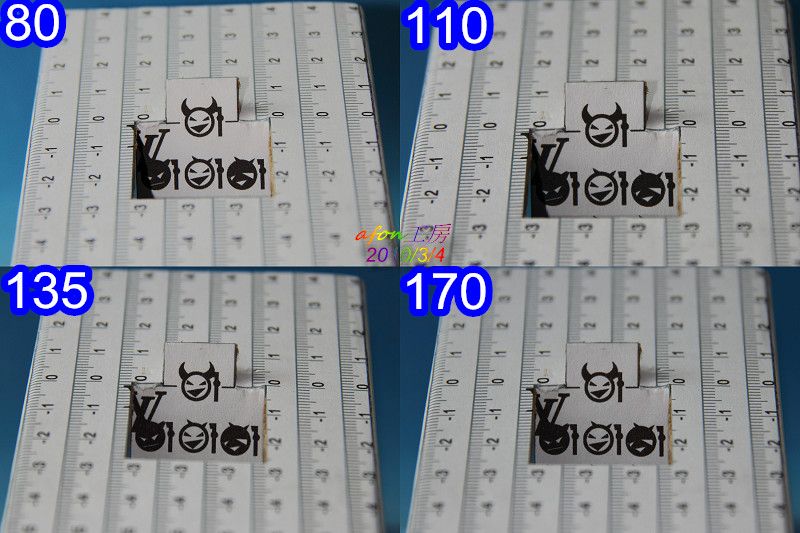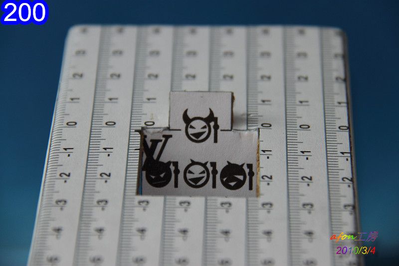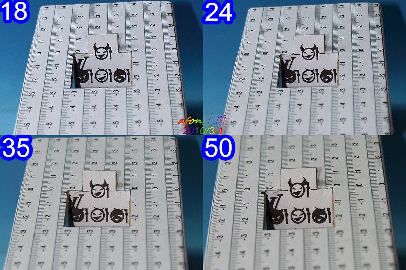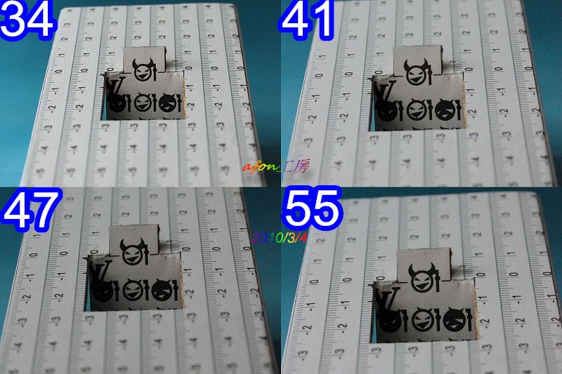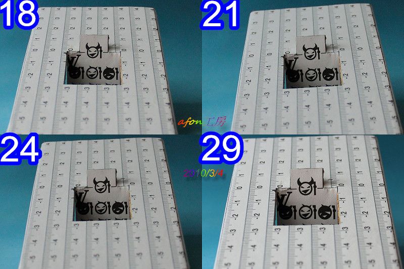 測焦(2)下載了這次測焦的工具後,將之列印並襯以瓦楞紙,裁切好再用萬能膠黏妥,就如照片中所見。01.再要測試的是18-200mm旅遊鏡,跟上次測試一樣,每張照片有4個焦段(以數字顯示),分別由上至下、左至右排列。第1張是18、24、35及50焦段。02.這張是80、110、135及170焦段。03.最後一張是200焦段,這旅遊鏡與套裝鏡一樣,最大光圈只有f/3.5,而從所得照片看,對焦應無問題。afon