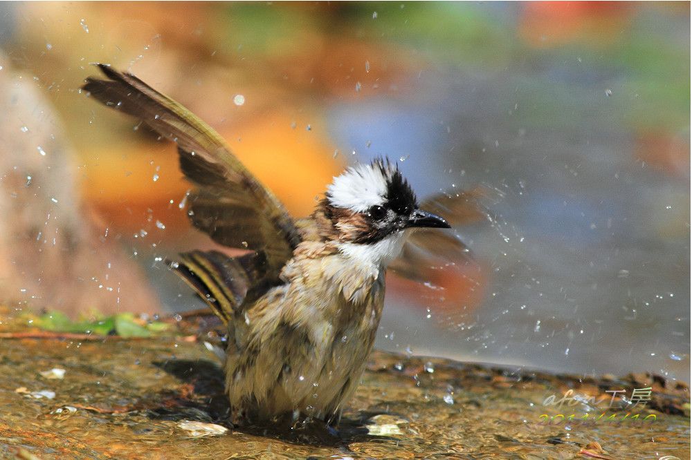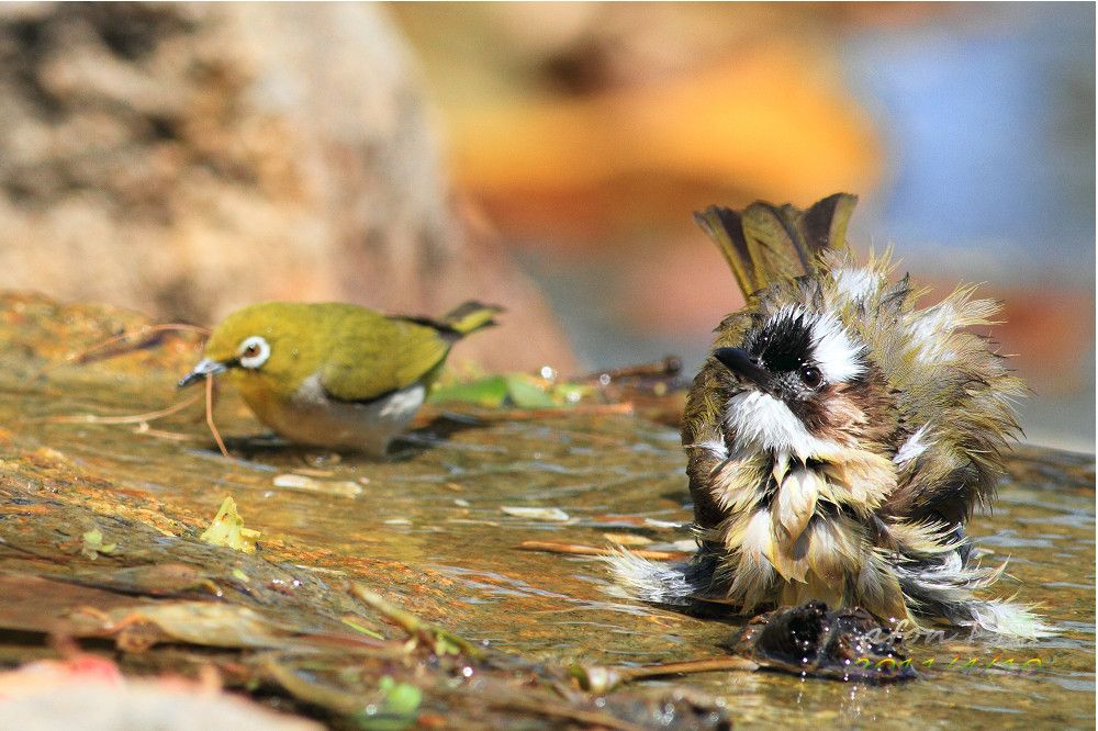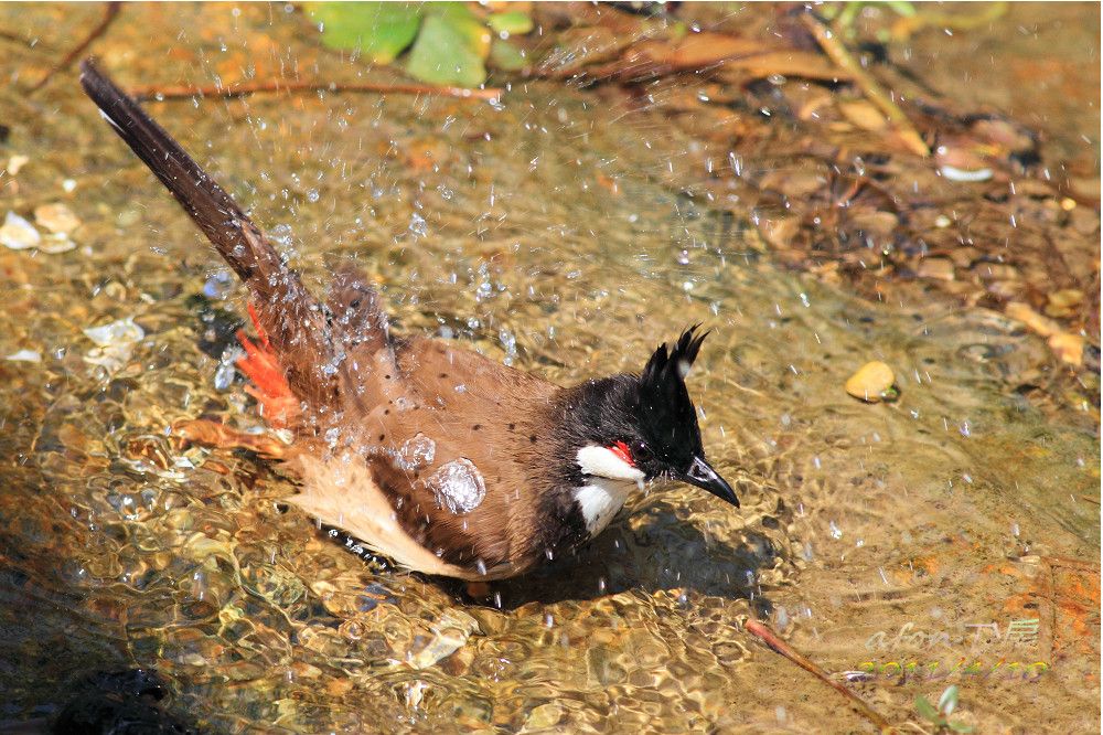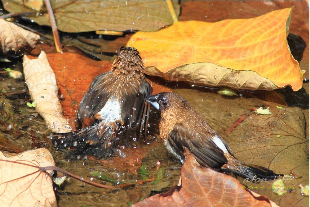白腰洗澡不像剛才的雀鳥,牠們大部分時間只將尾巴浸在水裡,而且抖起的水花也不多。