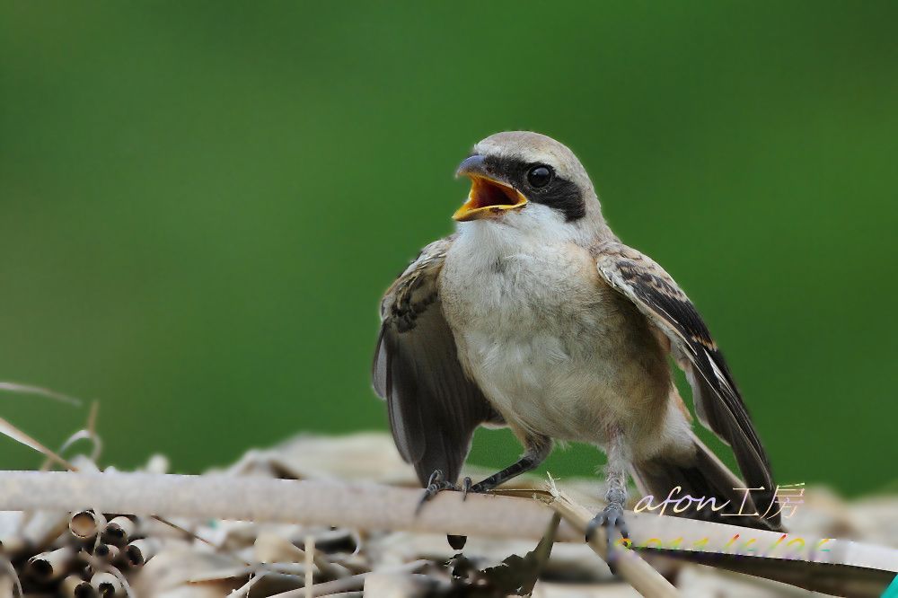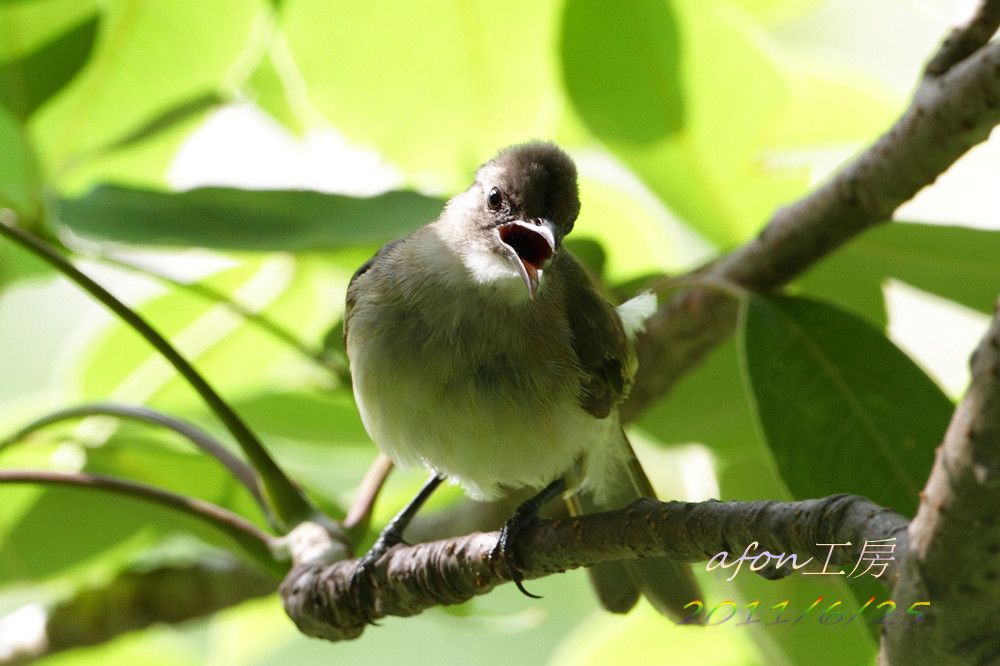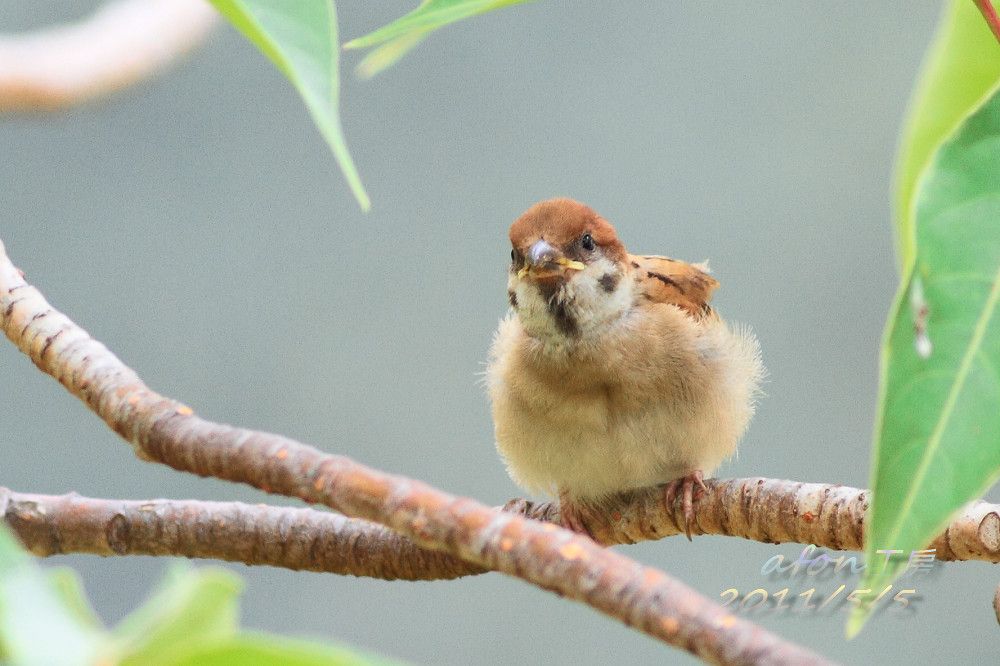 麻雀幼鳥蹲在樹上等待親鳥餵哺。