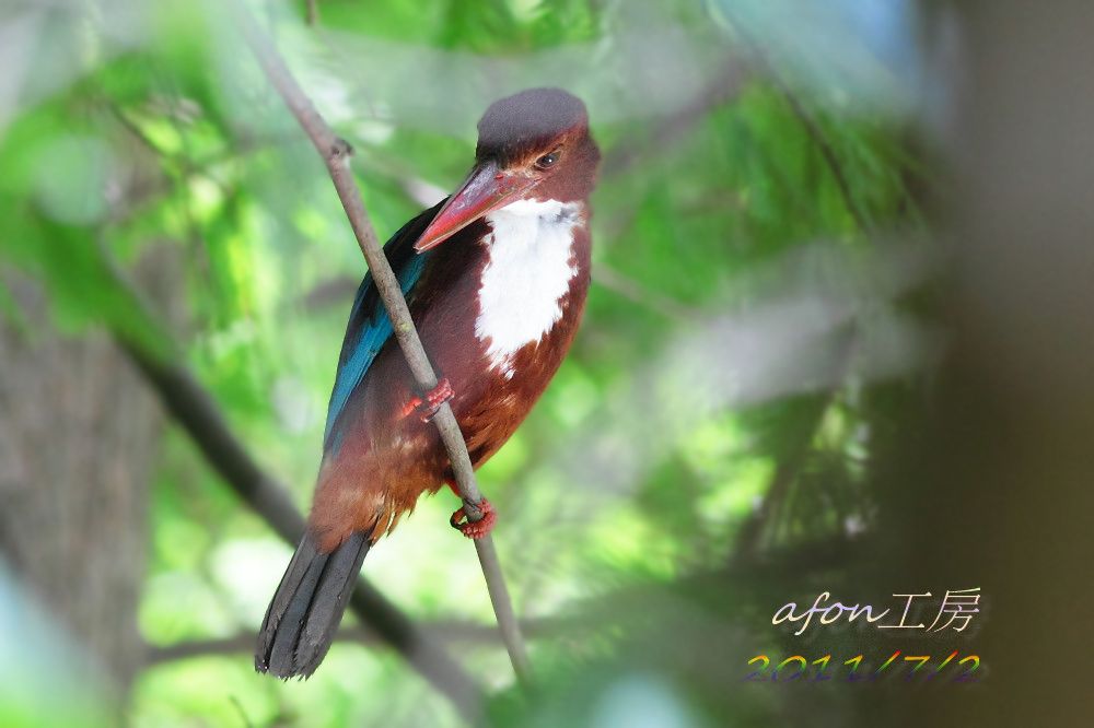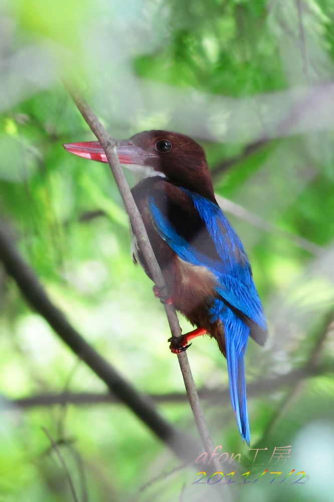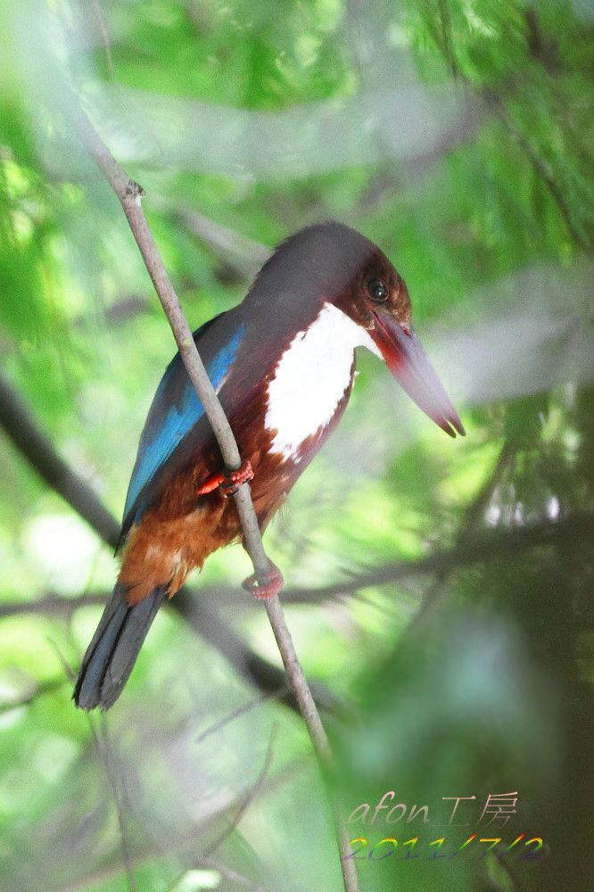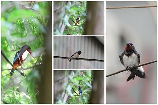 燕燕及林中翠前次北上拍大翠,結果空手而回。靜極思動,在這多天雨天,早已計劃好外拍的行程。今早出門不久,在十字路口停車時,忽然聽見幾聲鳥鳴。一抬頭,就見到兩隻燕燕蹲在電線上。01.泊好車,立刻拿出相機(由於要北上,所以只帶了456),手持向這隻家燕BarnSwallow掃射。事後檢查〝戰果〞,在光線不足的條件下,ISO達至最高的3200,雜訊超多,唯有請出〝PS大神〞幫忙處理了。02.剛才的一隻是成鳥,看來應是這隻幼鳥(嘴角仍帶黃)的親鳥吧。03.二話不說,火速過關,到達現場立刻擺放裝備。這次決定穿迷彩斗篷實地拍攝,等了(餵蚊)約半小時,這隻白胸翡翠White-throated Kingfisher終於出現了。04.雖估計牠不太害羞,但見牠仍相當謹慎地在湖的兩岸樹頂徘徊了一會,才飛到那條〝翠枝〞旁的樹上。而且還在樹頂等了十多分鐘,始跳到3、4米高的橫枝上。05.雖然今天見不到牠的插水捕魚表演,但也拍了幾張上〝翠枝〞的照片。此外,最高興的是認識了〝為人民服務〞的前輩鳥友。所謂飲水思源,大家可以拍白胸上〝翠枝〞,實全賴這位前輩。在此,要向前輩致敬。環保鳥攝,您我做起。afon