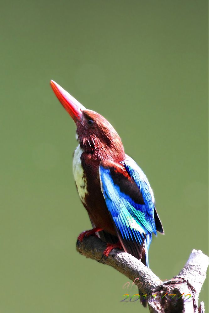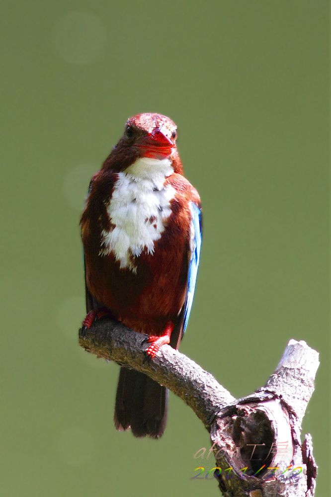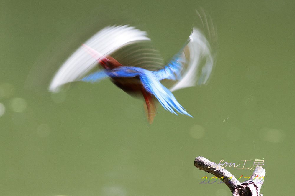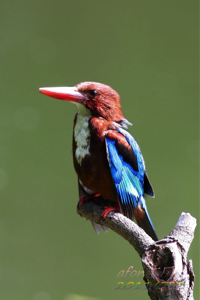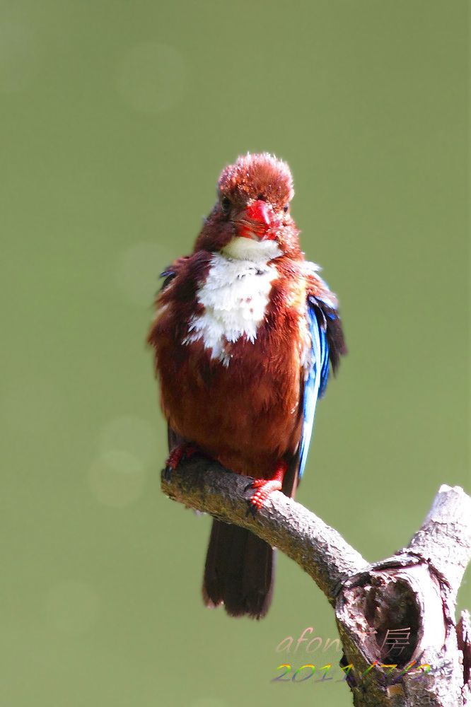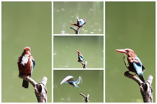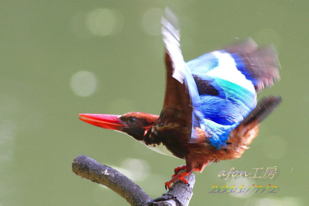 翠舞拍了一年多,總結自己的體驗。陰天光線太暗,這種拍攝條件當然不好,但覺得總比晴天但陽光陰晴不定好。擺放好器材後,主角尚未到場,趁機做好拍攝設定。然而,變化總比計畫來得快。等到主角肯飛到〝翠枝〞上,老天爺就來個惡作劇。01.這隻白胸翡翠White-throated Kingfisher一上〝翠枝〞,立即來一場抖羽毛表演。恰巧這時的陽光卻來記猛的,所以大翠伸展的翅膀上的白色部分就像塊反光鏡一樣。而且,牠深色的頭部卻背著陽光。如此,儘管〝PS大神〞如何神通廣大,照片也落得這樣的效果。02.後來聽前輩鳥友說,白胸每次上枝頭的時間不會太長,頂多只是3、4分鐘而已。03.初時還以為牠會像翠湖的同類那樣,一蹲就動也不動的。04.只見牠蹲了沒多久,就擺出這個如火箭的姿勢,知牠即將飛走。05.果然,接著牠就再次飛上湖邊的樹上。編輯照片時,第一感覺是這些飛行照太爛了,但定神再看,又覺得這個姿勢有點眼熟。對,有點像敦煌的飛天(老王賣瓜),所以決定將之處理一下。環保鳥攝,您我做起。afon