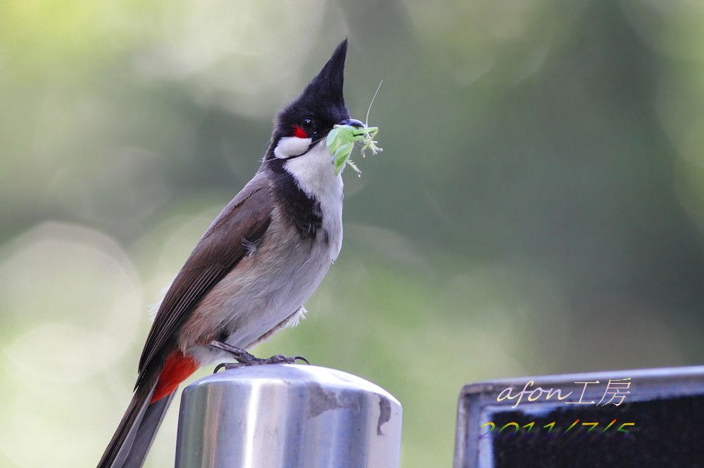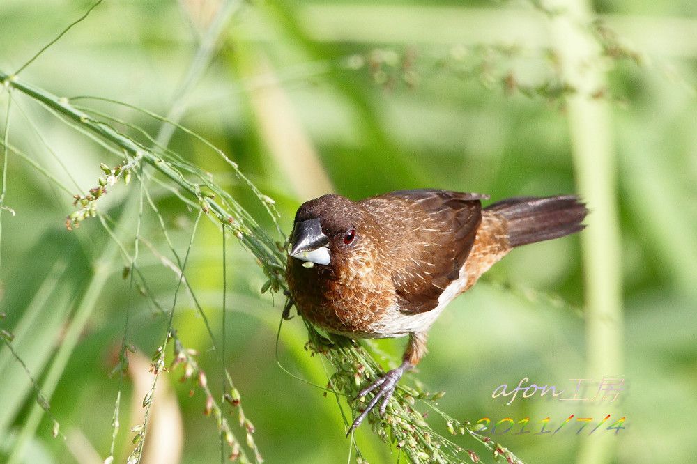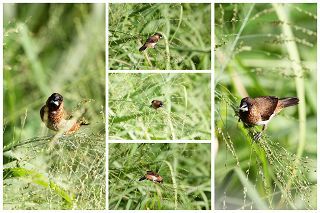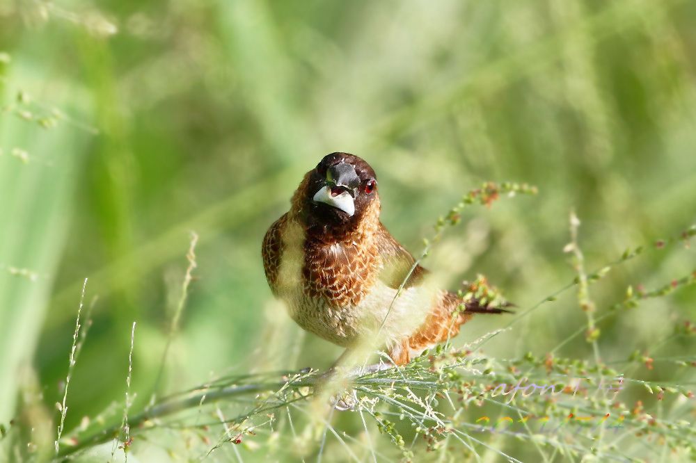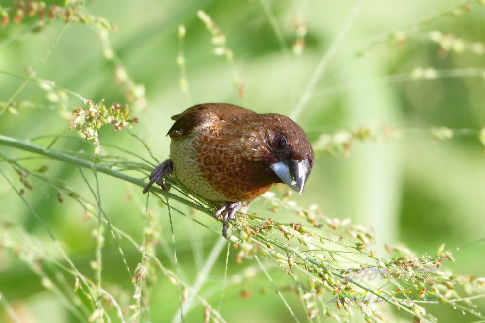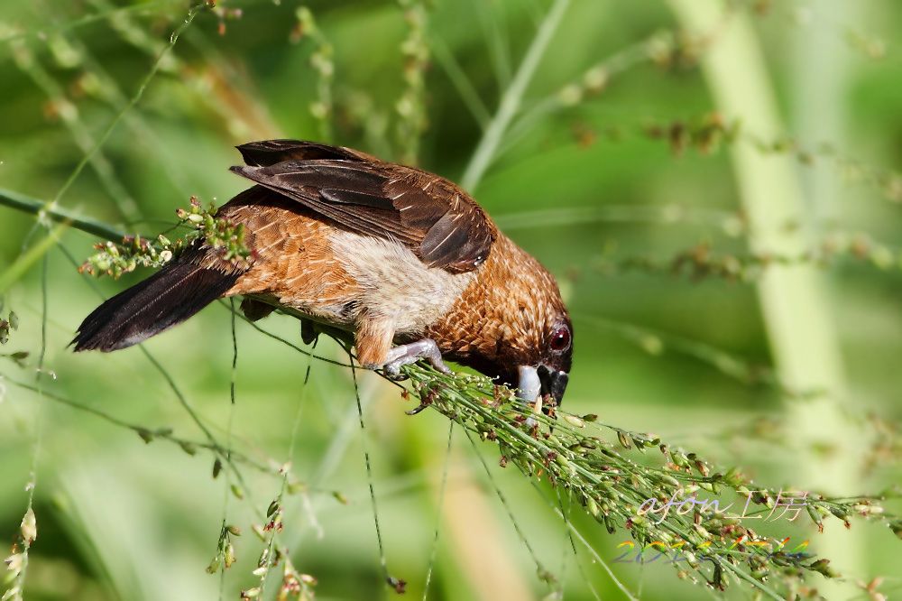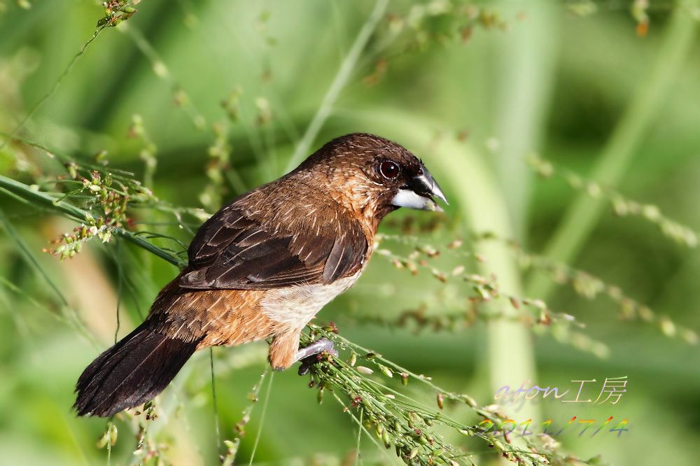 粒粒皆美食雖說是早起,但上到山上已接近7點了,而且太陽已像烤肉的火一樣熱。正如書上所說,早上的鳥兒為了進食,警戒心都會低一點。今天就來看看素食主義者吧。01.紅色虹膜,黑色上嘴,灰白色下嘴,嘴呈三角形,這隻傢伙像在展露笑容一樣。02.牠正在以這些禾本科植物的種子當早餐,吃得津津有味。03.全身羽毛顏色主要是褐色及黑色,而且還有白色的部分。04.對,牠的腰部是白色的,牠就是白腰文鳥White-rumped Munia。05.今天主要以這白腰為測試對象,結果是關掉防抖功能,效果似乎要差一點。06.再來一張白頭鵯Chinese Bulbul幼鳥。環保鳥攝,您我做起。afon