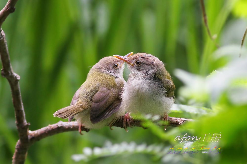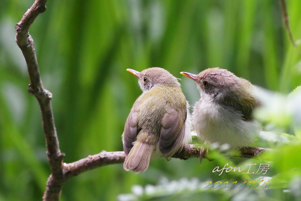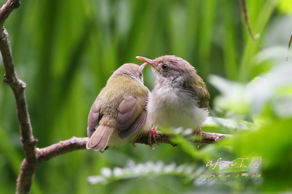 兩小無猜剛過去的颱風米雷雖然並未進入本澳的警戒範圍,卻給我們帶來差不多整個星期的壞天氣。每天看著窗外的傾盆大雨,人也快要發霉了。今天起床時,意外地發現不再下雨了,趕緊帶了456(還是有點怕路上下雨,584就暫時休息一下吧),三步并兩步地跑上山。01.在山上轉了一圈,發現幾隻白腰文鳥在遠處一叢有穗的禾本科植物上吃種籽。然而,走近時白腰卻已無影無蹤了,幸好在附近草叢邊發現這隻在照鏡的幼鳥。02.細看之下,牠不是在照鏡,那是兩隻在對望的幼鳥而已。03.這是兩隻長尾縫葉鶯Common Tailor Bird幼鳥,見牠們的動作真是趣緻。04.牠們一致的動作說明了,其實長尾媽媽就在附近,小傢伙就在等候親鳥送食物過來。05.雖然常提醒自己在觀鳥時不應帶著人類的眼光,但在編輯照片時,這個標題就第一時間跳出來了。環保鳥攝,您我做起。afon