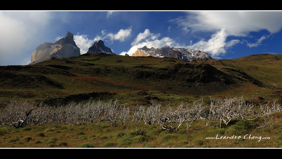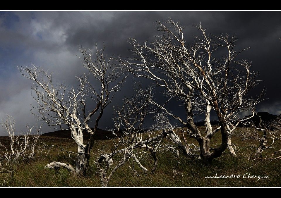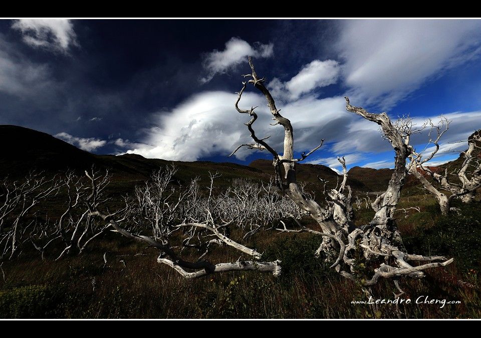幾年前百內國家公園發生火災, 一些樹木被燒成枯木, 配上烏雲形成強烈的對比.