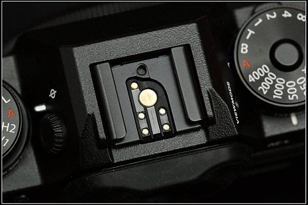X-T1的熱靴座 , X-T1沒有內建閃燈 , 不過盒裝內有隨附一顆小巧可愛的外接式閃燈EF-X8 , GN值只有8