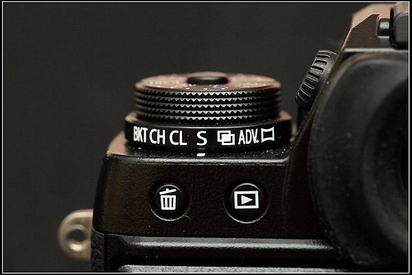 除了ISO大轉盤外 , 底下來有一個轉盤 , 這是模式選擇 , 有包圍曝光 , 高速連拍 , 慢速連拍 , 單張拍攝 , 重複曝光 , 進階濾鏡 , 全景等幾個選擇