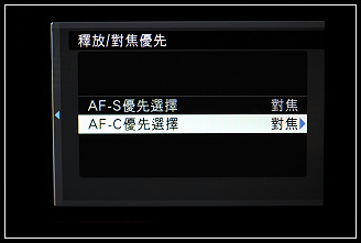 自動對焦設定 , 不管是AF-S或是AF-C皆可選擇釋放優先或是對焦優先 , 我是習慣選對焦優先 , 釋放優先可能會拍的比較快 , 但是如果拍出來沒對到焦也沒用..