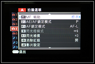 選單第四頁是MF , AE/AF模式 , 閃燈控制及影片的設定
