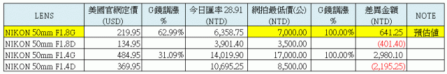 SElephant wrote:不可能吧?美金的MSRP也不過六千台幣出頭...(恕刪) 我很相信台灣的代理商的勇氣...雖然我不會買, 也不關我的事也多事的做了一點整理(好久沒認真回文了)黃色是個人推估, 以下是個人不負責任想法, 不中意可以跳過1.二支50mm G & D鏡的調幅率在美國是30~60%, 在台灣市場50.4G的調帳率達100%, 所以我想50.8G也是2.看二地D&G鏡訂價, 匯率不是影響台灣代理商訂價的因素, 只會是漲價的好理由3.台灣國祥的官網定價太芭樂,不值的參考, 所以個人用市場買的到的最低價來推算4.G鏡是可以賣更貴的好理由, 可以賣七千(再上去會蓋到50.4D的市場),幹嘛賣你五千...?那誰買50F1.8D?(不停產的前提下)再次強調以上是個人不負責任的想法, 不中意可以跳過但我很相信會賣個七千上下...