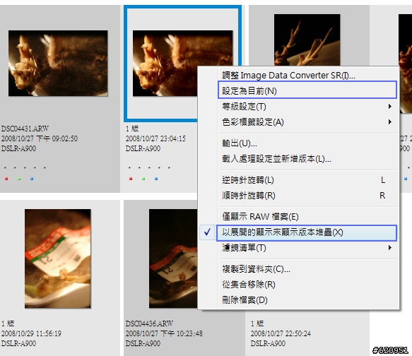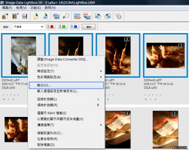 用的是A700, 不過程式都一樣. 你講的到建立兩個版本這個步驟都很簡單, 速度也很快. 但是要輸出時, 問題就來了! 照說你既然已經套用了修改, 你要的版本就是應該修改以後的, 而非原來相機拍的原始版本. 但是, IDC的原廠設定是會輸出原來的舊版本, 而非修改後的新版本. 你如果要輸出新版本, 一定要用手選一圖一圖的選. 但是我找不到程式裡頭可以自動一次全部選的, 結果我上次旅行一回來, 七百多張照片一張一張選擇新的版本輸出, 把我的手都快選斷了! 那也安捏啦? 鬱卒 大大是否知道哪裡可以自動一次全選新版,不用一張一張手選的? 不然真的我上次手動選了7百多張, 現在都還心有餘悸!! 無奈(恕刪)