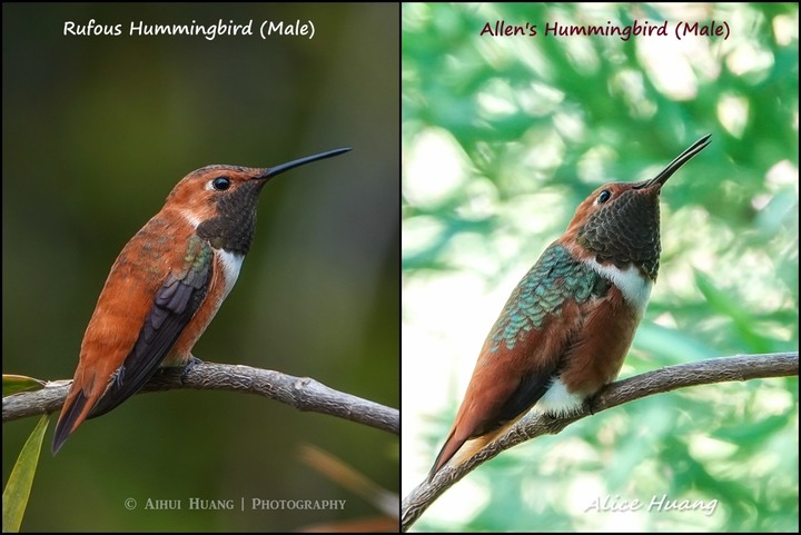 翻船 wrote:Rufous hummingbird...(恕刪) 回應 翻船 前輩 在 #6777 樓的留言~~Allen's Hummingbird 與 Rufous Hummingbird 兩種不同的蜂鳥在正面的模樣上是一樣的,要分辨 Allen's 和 Rufous 要看牠們的背部羽色,Allen's 的背部大約有2/3是綠色,1/3是橘色;而 Rufous 的背部則全部是橘色。以下是我拍到的畫面,兩隻不同的種類的蜂鳥都是公鳥,請您參考!