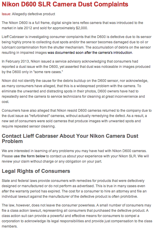 http://nikonrumors.com/2014/02/15/law-firm-collects-nikon-d600-sensor-dustspot-complaints-for-a-potential-class-action-lawsuit.aspx/#more-72196