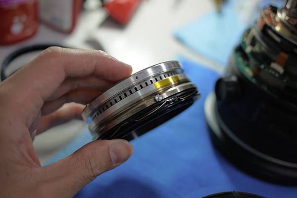 晚上10點多~~我帶著這顆鏡頭到維修的老前輩面前,拜託他幫我打開這卡死已久第二鏡筒,不愧是老前輩,第一句話就問我,你確定是這個方向打開她,沒有其他螺絲鎖著,你確定嗎?