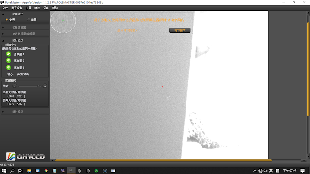 - 近七點上頂樓,由於有霧,極軸校正很困難,電子極望只能看到北極星,其他校正星一顆都看不到,只能憑著把器材擺放與前一晚差不多位置,粗略校正而已。