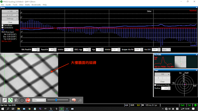- 近凌晨一點時上頂樓查看,夜深人靜,遠遠就聽到 PHD2 因 Star Lost 發出的警告聲,一看筆電才知已拍到建築物,趕緊結束拍攝,然後下樓拿了 iPad Pro 上來拍亮、暗平場並收拾器材。