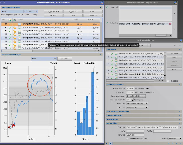 - 因為 DSLR 無法控制感測器溫度,乾脆就不拍暗場,但拍攝時一定要 Dither。設定 ISO 1600 單張曝光 300 總共拍了 51 張,扣掉拍到建築物的 7 張,餘 44 張用來疊圖 ,SubframeSelector 後,刪掉權重分數較低的 4 張來 StarAlignment ,累積總曝光時間近三個半小時。