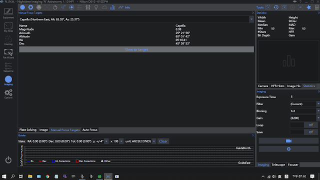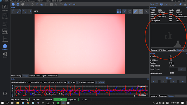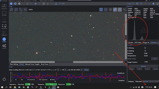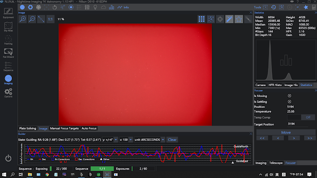 - 重新再 RUN 一遍拍攝流程並與前一晚比較,猜想有可能是前一晚無法拍攝靈魂星雲及心臟星雲後,有點忙亂,以不同 ISO 試拍,又碰到赤道儀的 USB 接頭而失去連線,沒有先斷開相機及 EAF 就結束 NINA,導致 NINA 程序留在背景,沒有正常結束,再開啟 NINA 後拍攝才出現 D610 曝光不正常的現象(這是使用工作管理結束了背景裡的 NINA 程序才了解的,所以說最簡單的方法就是重開機即可。)。以往不曾中途結束 NINA ,就算早前幾次的雙目標拍攝也很順利,拍完才結束 NINA,因此才不會碰到這種況。