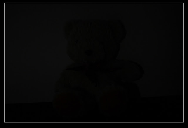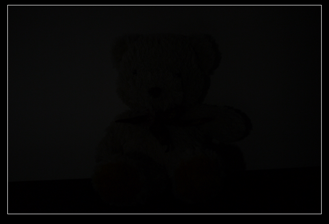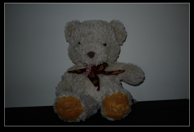 環境極微光幾乎看不到東西。設定為M模式,F1.7,快門125,ISO200,相機離布偶約50公分。