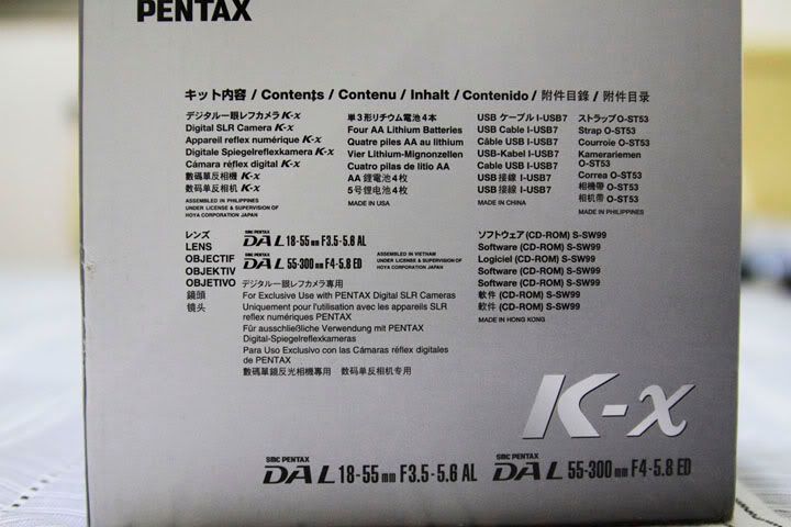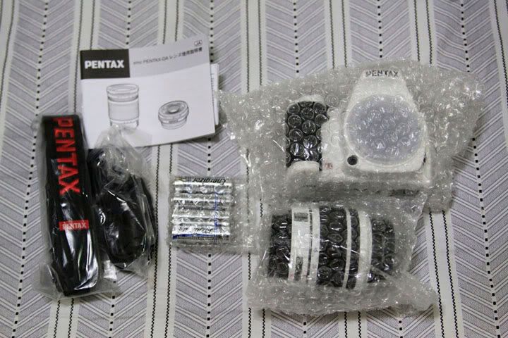 所有內容物: 機身, 鏡頭, usb傳輸線, Pentax原廠相機背帶, 四顆AA電池, 鏡頭說明書