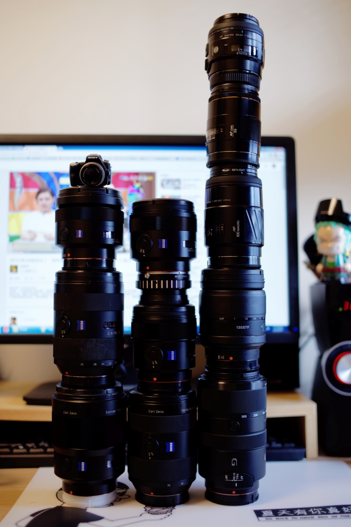 小弟感謝唐大開版,以身試法,身先士卒,身體力行,身手矯健,身家調查...也感謝各位疊友的支持與鼓勵!小弟在此就直接解答9/9/10是何鏡頭,各位免猜了。中排FE系列鏡頭,由上往下算:FE35/2.8ZA-28/2-55/1.8ZA-2870-2470ZA-1635ZA-90GM-35/1.4ZA-70200G左排手動鏡由上往下:CZJ/50/2.8-CZJ/35/2.4-CZ/T45/2.8/CY-CONTAX/G35-CONTAX/G90-LEITZ/SUM/M50/1.5-VM/35/1.2II-VM/50/1.1-東京鳳凰/58/1.4右排10顆A鏡由上往下:MINOLTA/50/1.4-MINO/50/2.8M-SIGMA/15/2.8魚眼-TAMRON/28300-SIGMA70300/OS-SAL/85ZA-SAL/135/STF-MINO/200/2.8G-SAL/135ZA-MINO/500R由於尺寸大小不同所以難疊,因此有2顆未裝鏡頭蓋,好幾顆需拆鏡後蓋,3顆正裝原遮光罩,才順利疊完未損傷。報告完畢!lml640707 wrote:G大真英雄小弟就當...(恕刪) lml大G鏡很難疊啊,又輕又小,口徑還相同居多更難疊,疊上去重心高啊