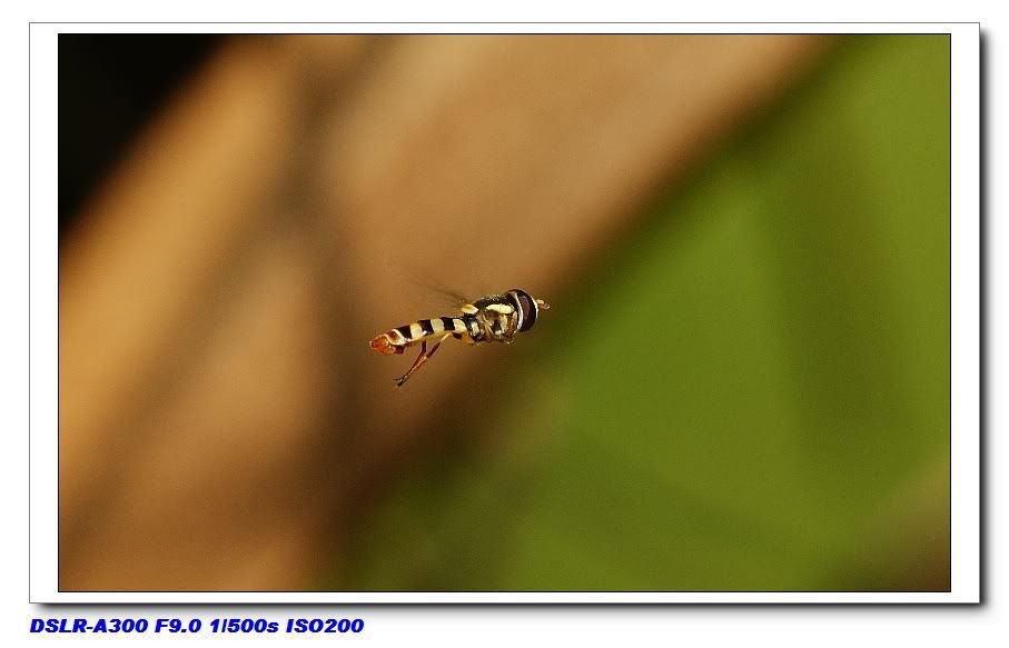 請問各位前輩有時候蜜蜂一直飛動那對焦點要怎麼抓呢我拍的蜜蜂都會糊糊的,因為他一直亂飛我會脫焦可否指導拍攝技巧給在下,謝謝補圖 SONY A350KIT品牌 SONY型號 DSLR-A350影像敘述 SONY DSC曝光時間 1/320 sF 值 5.6曝光程式 一般程式ISO 感光度等級 100品牌 SONY型號 DSLR-A350曝光時間 1/500 sF 值 5.6曝光程式 一般程式ISO 感光度等級 100請各位前輩給予意見指教