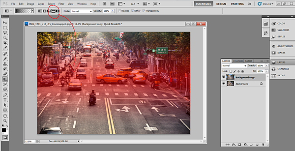 (3-1) 在 Quick Mask 模式下,將畫面中預計要清楚的部分用漸層工具蓋住,本次的範例