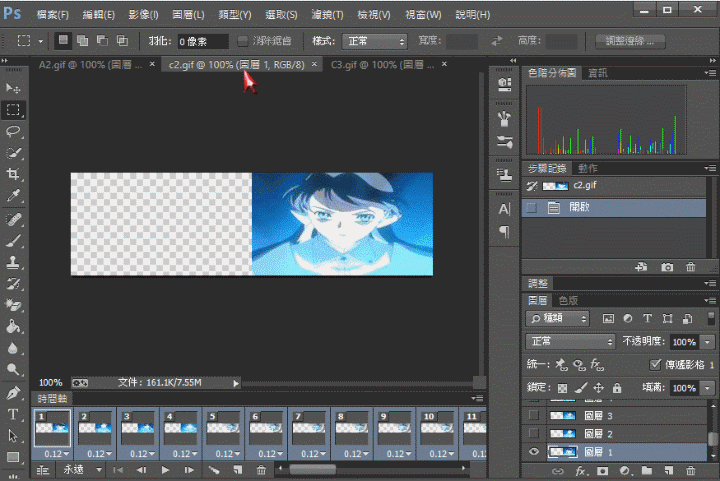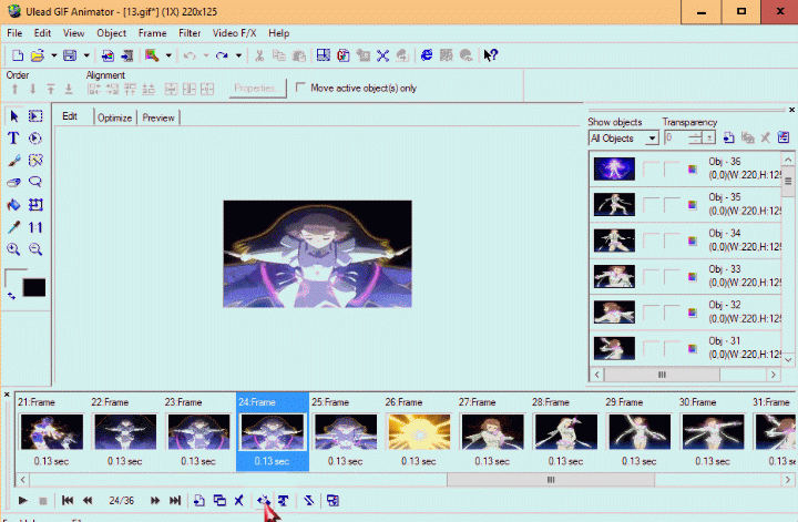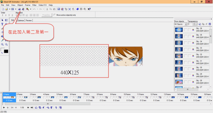 目前想將動畫的截圖做為某網站的簽名檔,且我已經用軟體抓好我要的片段,該網站的簽名檔格式為660*125,我在動畫中擷取了三段我要的畫面,並將畫面大小縮成220*125,我想將這三張GIF動圖橫向合併成660*125的動圖,我也確定這三張動圖都是37畫格,該怎麼合併呢? 我用Photoshop自己摸也摸不透,Ulead GIF也是,目前我是想使用Ulead GIF這軟體來做橫向合併 並輸出,該怎麼做呢?