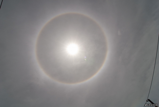 上午看到的景,太陽週圍有一圈彩紅,順手拿起相機拍了下去。(本人技術超不好,傷眼勿怪...)肉眼可以看到週圍的那圈彩虹。小弟有個疑問,請問有其他前輩同好有看到嗎?還有那算是光暈嗎??因為小弟的友人一直說那是騙人的.....