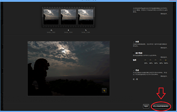 step6.如果是手持包圍曝光的話容易產生鬼影(建議上腳架),可以選"減少鬼影",點"建立高動態範圍攝影"