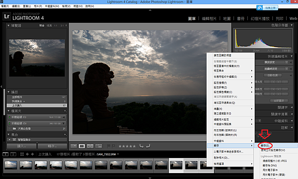 step4.安裝完畢後打開lightroom,選擇不同曝光的照片,雄弟的習慣是用"包圍曝光"(若不懂請google"包圍曝光")拍三張不同曝光的照片,再來點"轉存"