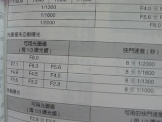 我也有找過wiki的解釋..... 它不也是說 : Typically, a fast shutter speed will require a larger aperture to ensure sufficient light exposure, and a slow shutter speed will require a smaller aperture to avoid excessive exposure. 所以我才覺得怪怪..... f/2.8(大光圈)的最快快門比f/8.0(小光圈)的最快快門竟然還慢吶......