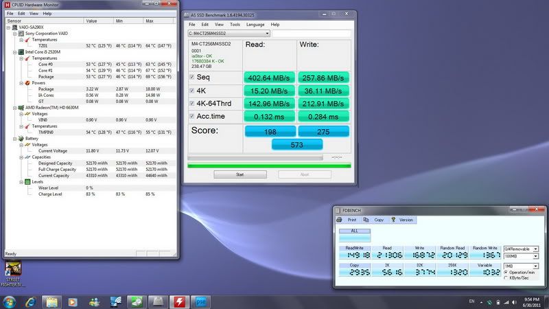 更換Micron M4 256GB SSD後傳輸速度測試...。402.64MB/s還是需要SATA 6Gb/s才餵得飽。左下角的是內建SD卡讀卡機測試,用TOSHIBA的16GB小白來餵。存取速度不再是雞肋,有一般USB2.0讀卡機的水準。