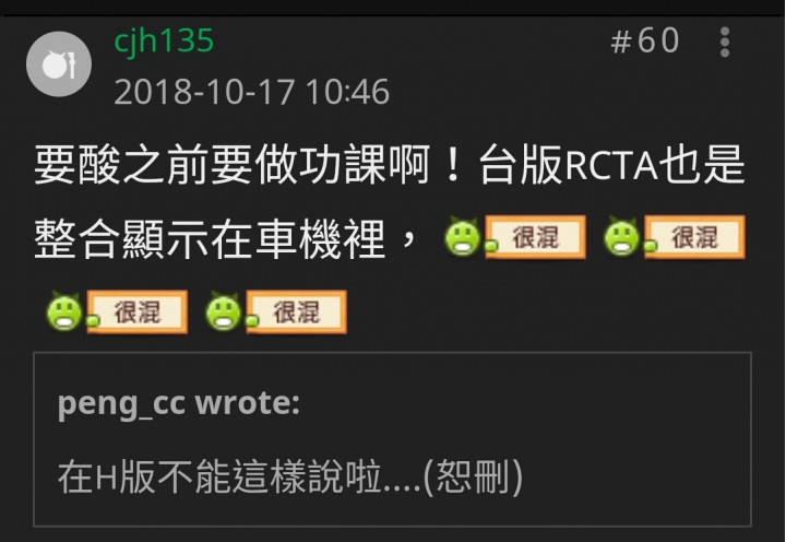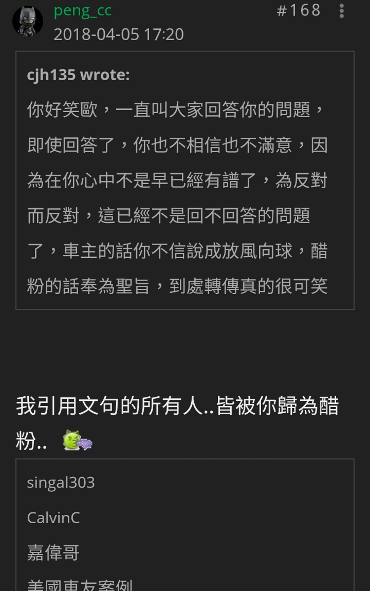 當時無論大家在討論什麼,你總會出現,沒頭沒腦的發一些黑粉文章,這是你的行事風格,但很多人不認同,所以很多都跟你槓上,結果你一個一個給大家出斷章取義的語錄(好好笑),記得那時我們車友還在陶侃誰的語錄比較經典