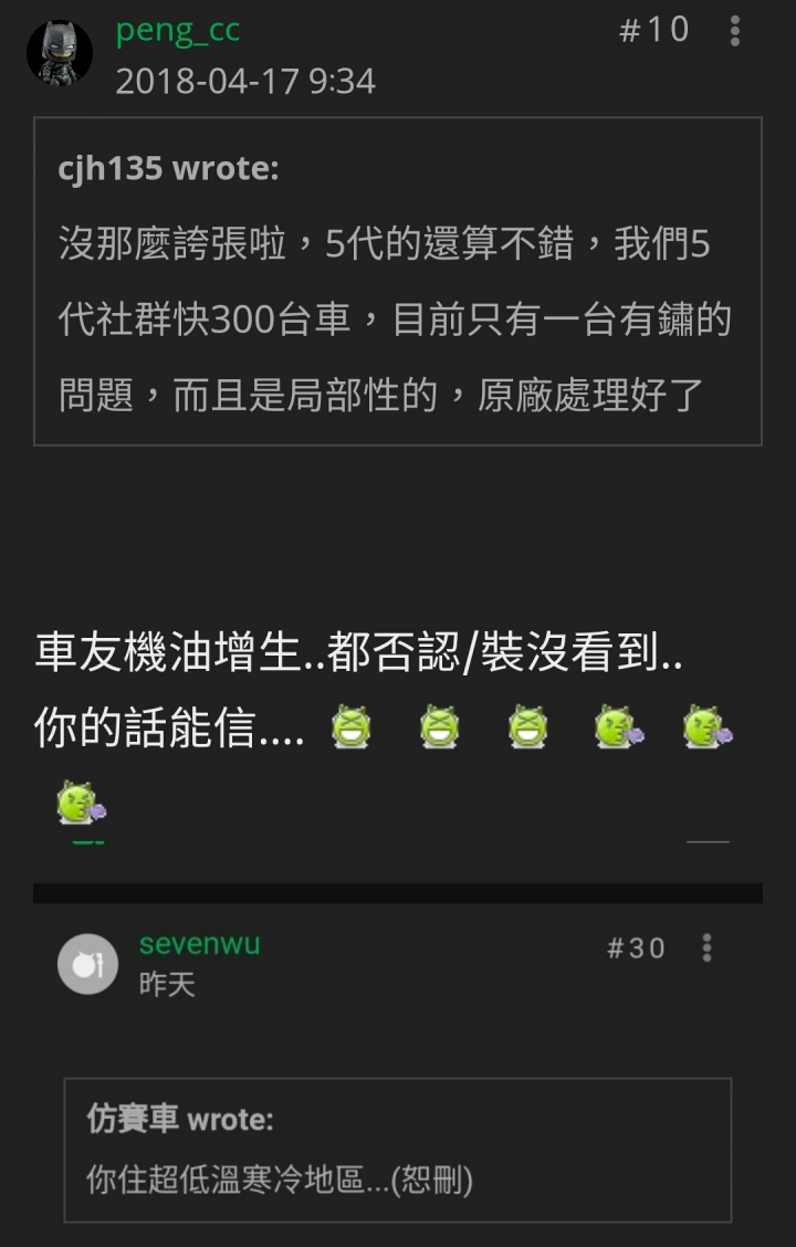 當初你講機油增生時,還一直說引擎會爆炸爆,其他網友看不下去,回你說是北美天氣冷才會發生,但你一直要其他網友拿出證據,一直跳針式的每篇都發文,垮張論調的說開一開引擎會爆炸,還叫大家不要買,我才會回你那有那麼誇張,除此,你還在五代許多問題積極抹黑,試問現在快2年了生鏽問題大規模發生嗎?機油增生有那顆引擎爆炸了嗎?
