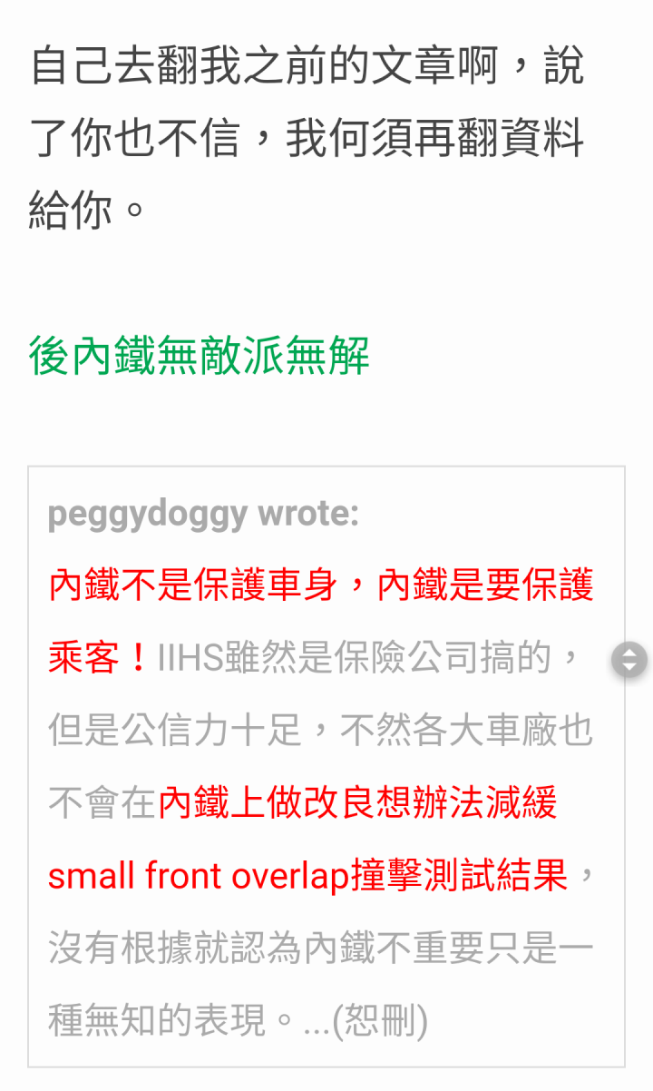 汽車安全設計是要全盤考量, 如果只強化內鐵, 可能會導致airbag & 安全帶動作時間產生誤差. 台灣的設定是用爛爛的內鐵做設定, 美國的車子用強化的內鐵做參數設定. 這兩個參數是否有誤差, 是否有安全疑慮, 這除非是有實際撞擊測試結果, 不然不得而知. 所以台灣原廠針對非台灣原廠的內鐵(相關聯的部品)不做保固個人認為是合理的.