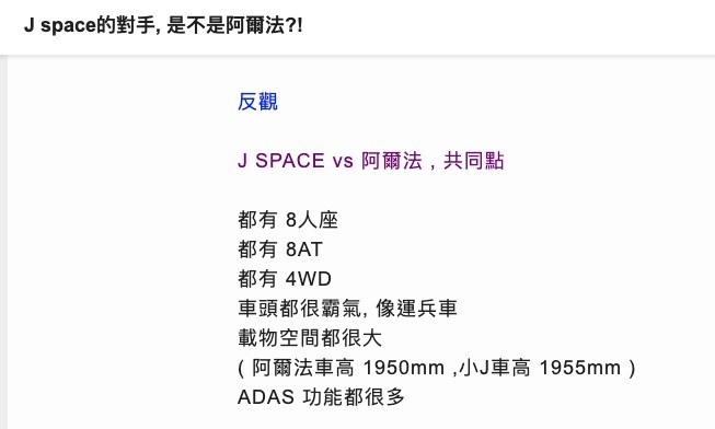 Sekai_mo wrote:看到版上的這篇置頂文...(恕刪) 要看什麼角度看,內建奢華感是絕對不可能比得上一台300-400多萬的但如果從經濟實惠的角度一台只要70幾萬的8人座J SPACE,怎麼看都超划算可以買好幾台,一次載更多群人