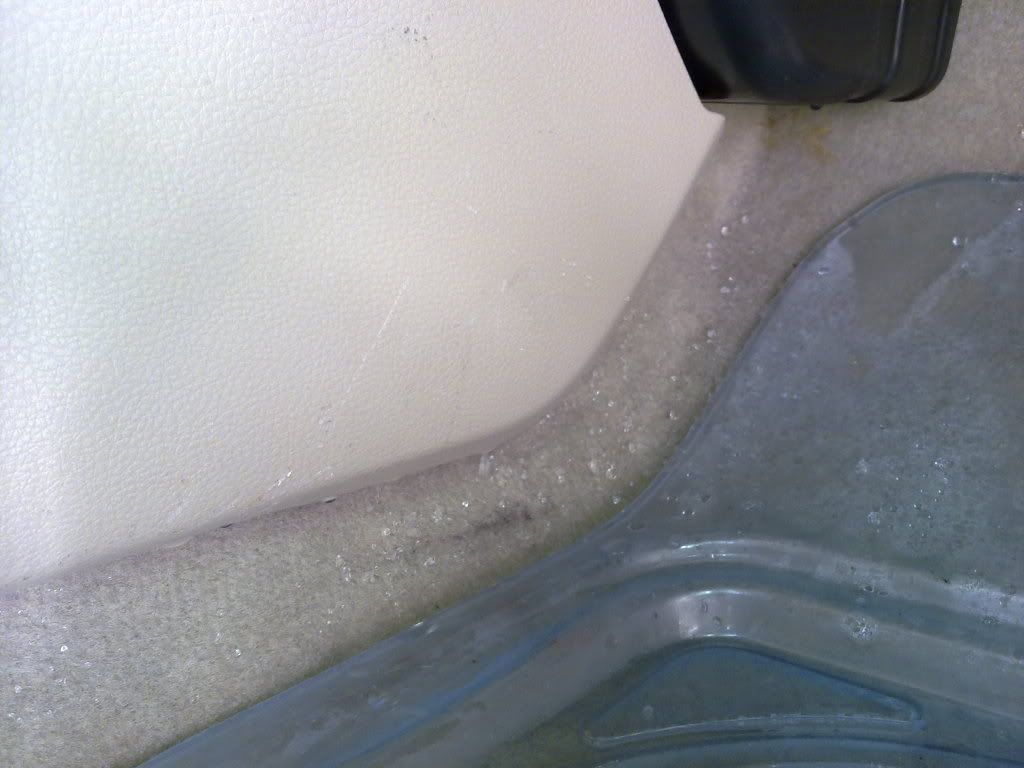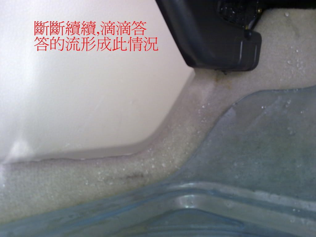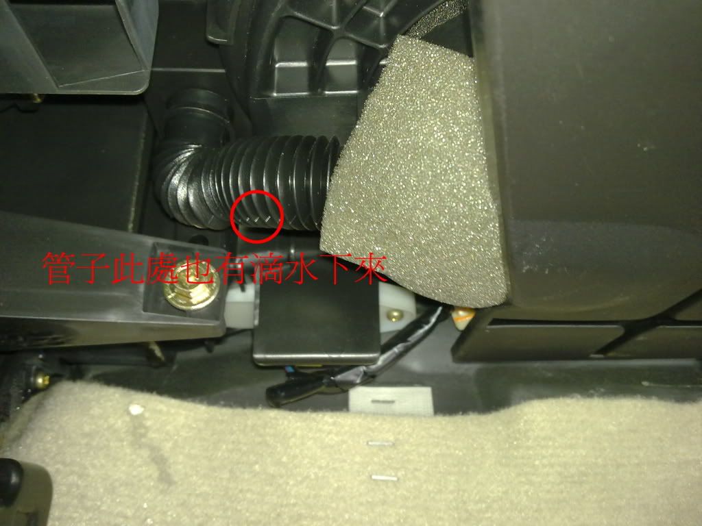 今天早上開車出門,兒子又發現漏水的狀況,這次可以確定水是從副駕駛座地板前方的管路流出來,斷斷續續,滴滴答答的流出來.回到家後副駕駛座的地板又有一些積水的狀況,也可以看到水從哪個地方流出來,我附上照片請各位幫我研