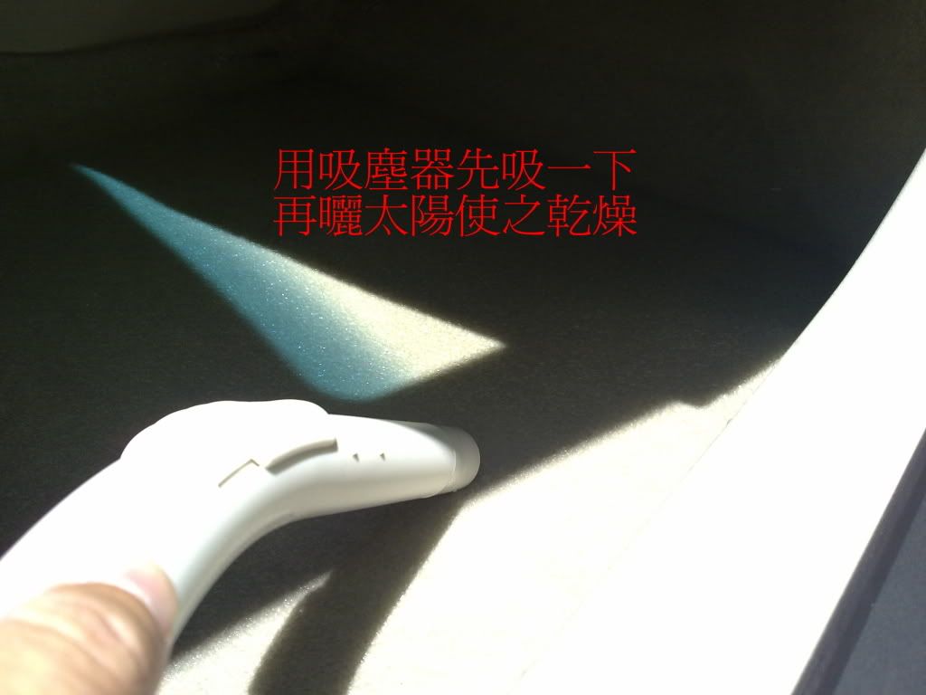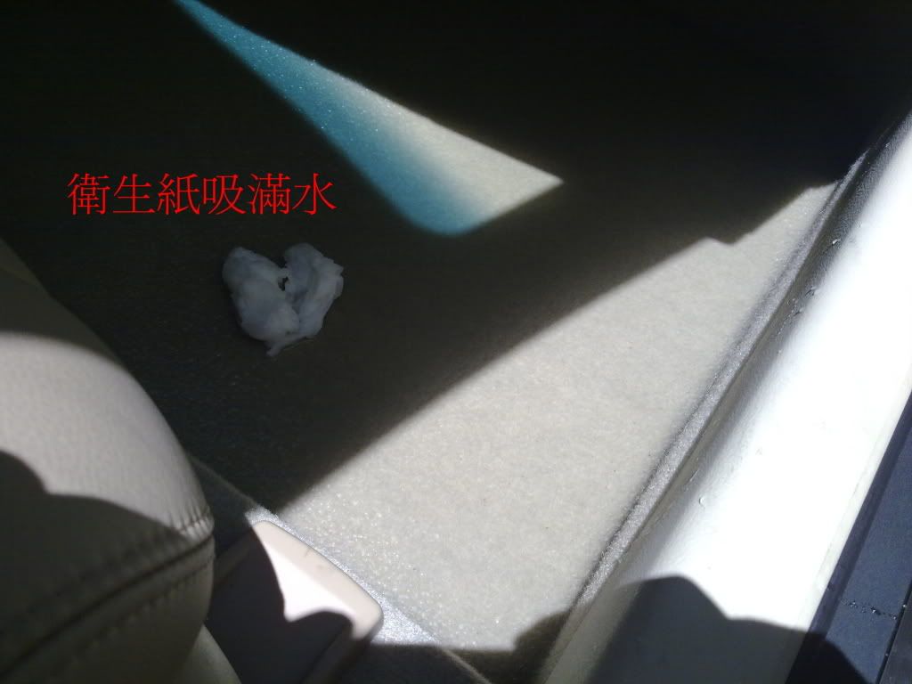 況.由於已經很晚了,回家後用吸塵器將水吸乾然後擺除濕機在車子裡面除濕一整晚.希望能把水吸乾不要發霉.