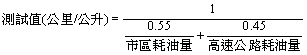 以55%之市區耗油量(第(1)項)與45%之高速公路耗油量(第(2)項),以調和平均數算出其平均油耗值,作為核定是否符合耗能標準之依據。單位亦為公里/公升。