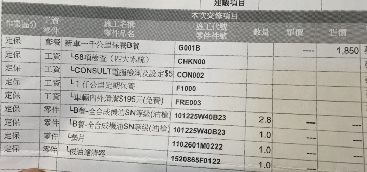 新車1仟5仟公里保養(免工資),依不同車型費用分別為1690元~2660元。